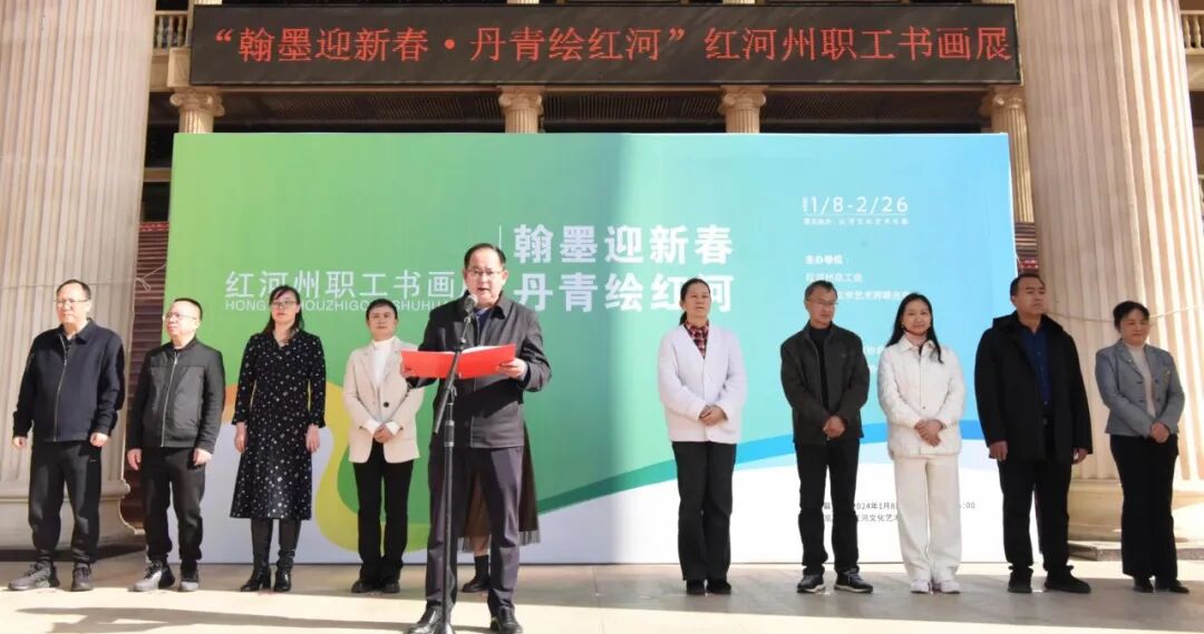 1月8日,由红河州总工会、红河州文学艺术界联合会主办,红河州书法家协会、红河州美术家协会、蒙自市总工会承办的“翰墨迎新春・丹青绘红河——红河州职工书画展”开展仪式在蒙自市举行。红河州总工会党组书记、常务副主席姜云出席仪式并讲话,州总工会副主席毕晓红主持仪式。州文联党组书记、主席岳建青,州文化旅游局副局长郑婷,州工商联副主席、秘书长王晶等州级相关部门领导出席活动。