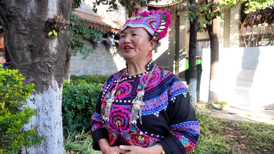 省级非遗刺绣传承人 李如秀说:“这种帽子叫鸡冠帽,横戴的鸡冠帽是我们永仁直苴独一无二的。永仁人看到这种鸡冠帽,无论身在何处,都会想起家乡。我们永仁的服装每一件都是自己设计制作的,可以说每一个绣娘都是设计师。这次我们带了60多套服装走进首届中国·楚雄时装周,永仁作为首场走秀,我们感到很骄傲。”