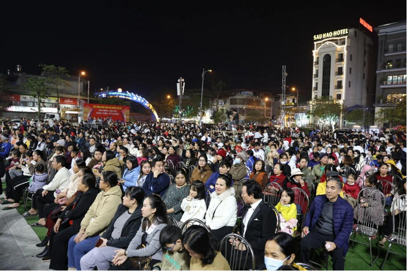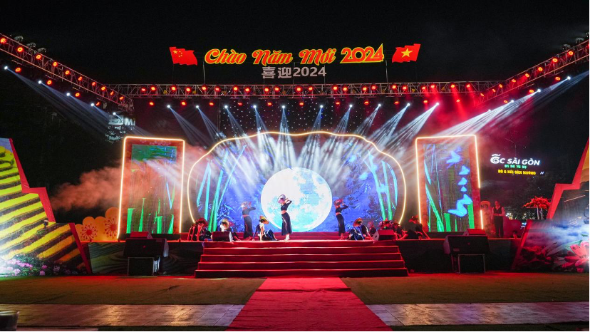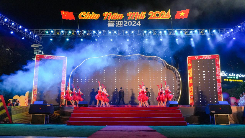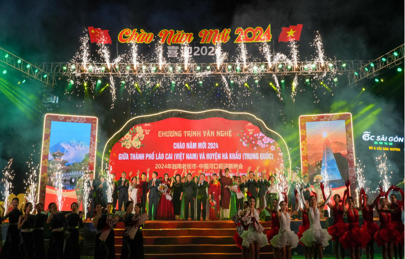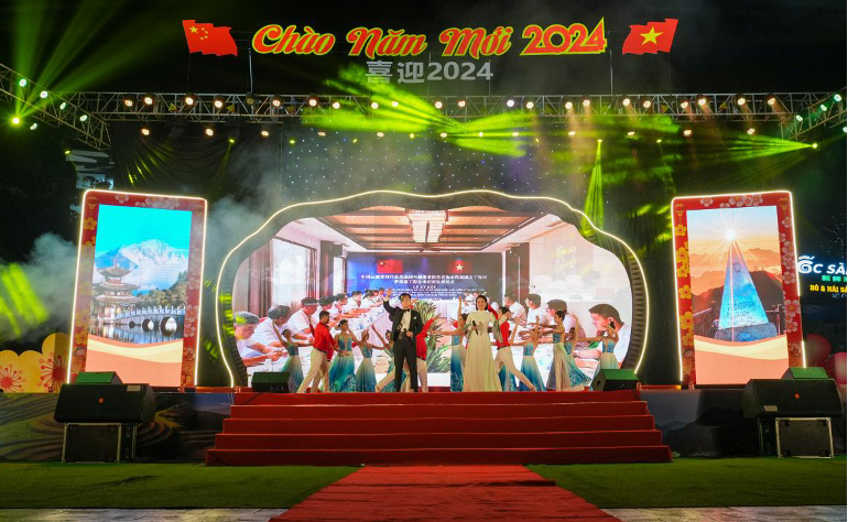 2023年12月31日晚,以“喜迎2024年”为主题,中国河口县与越南老街市迎新联欢晚会在老街举行。中越两国演员携手以歌舞联欢的形式为现场观众奉献了一场精彩难忘的视听盛宴。