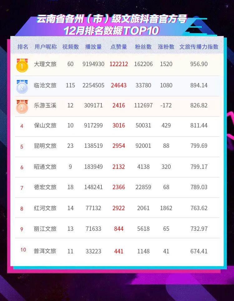 日前,云南文旅抖音影响力排行榜12月榜单发布,“临沧文旅” 排名较上月上升1位,排名第二。州(市)级文旅抖音官方号传播力指数综合考量每个官方账号在一段时间内数据周期的发布指数、传播指数、互动指数(点赞、评论、收藏、涨粉)、原创指数等计算“文旅传播力指数”。2023年,“临沧文旅”抖音号全年稳居云南省各州市抖音官方号前三名,成为全省文旅宣传的一颗璀璨明星。