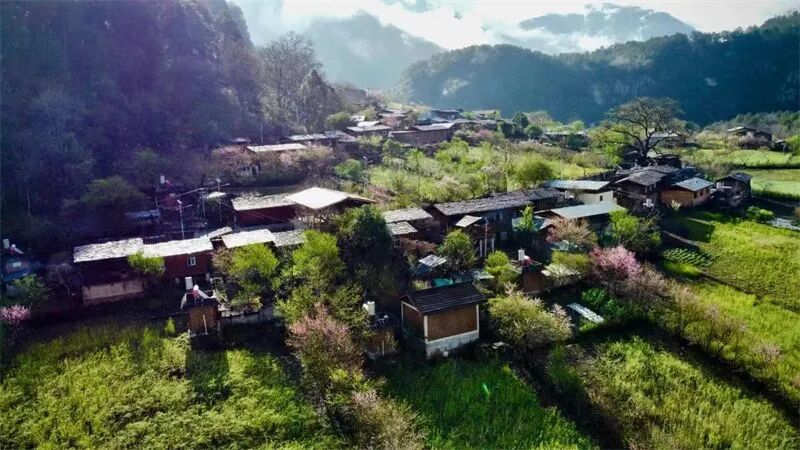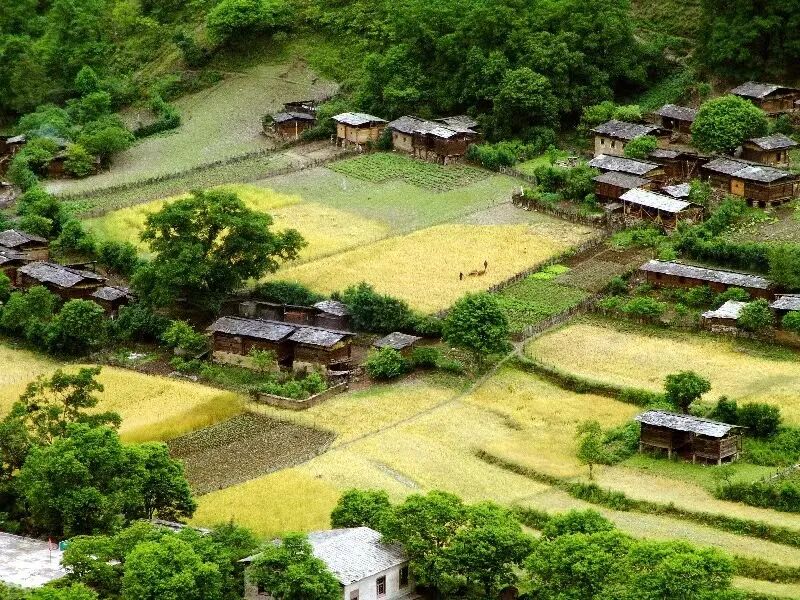 村子依山而建,周围风景秀丽独特,森林茂密、瀑布众多,人在峡谷中穿行,沿途景色十分壮观,不多的几户人家,散落在这美如画卷的山谷之中,几百年来繁衍生息,过着抬头即雪山、伸手触云彩的神仙生活。
