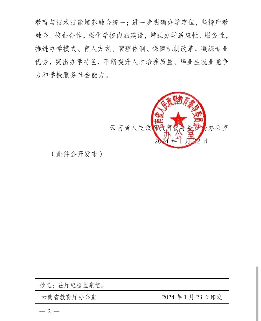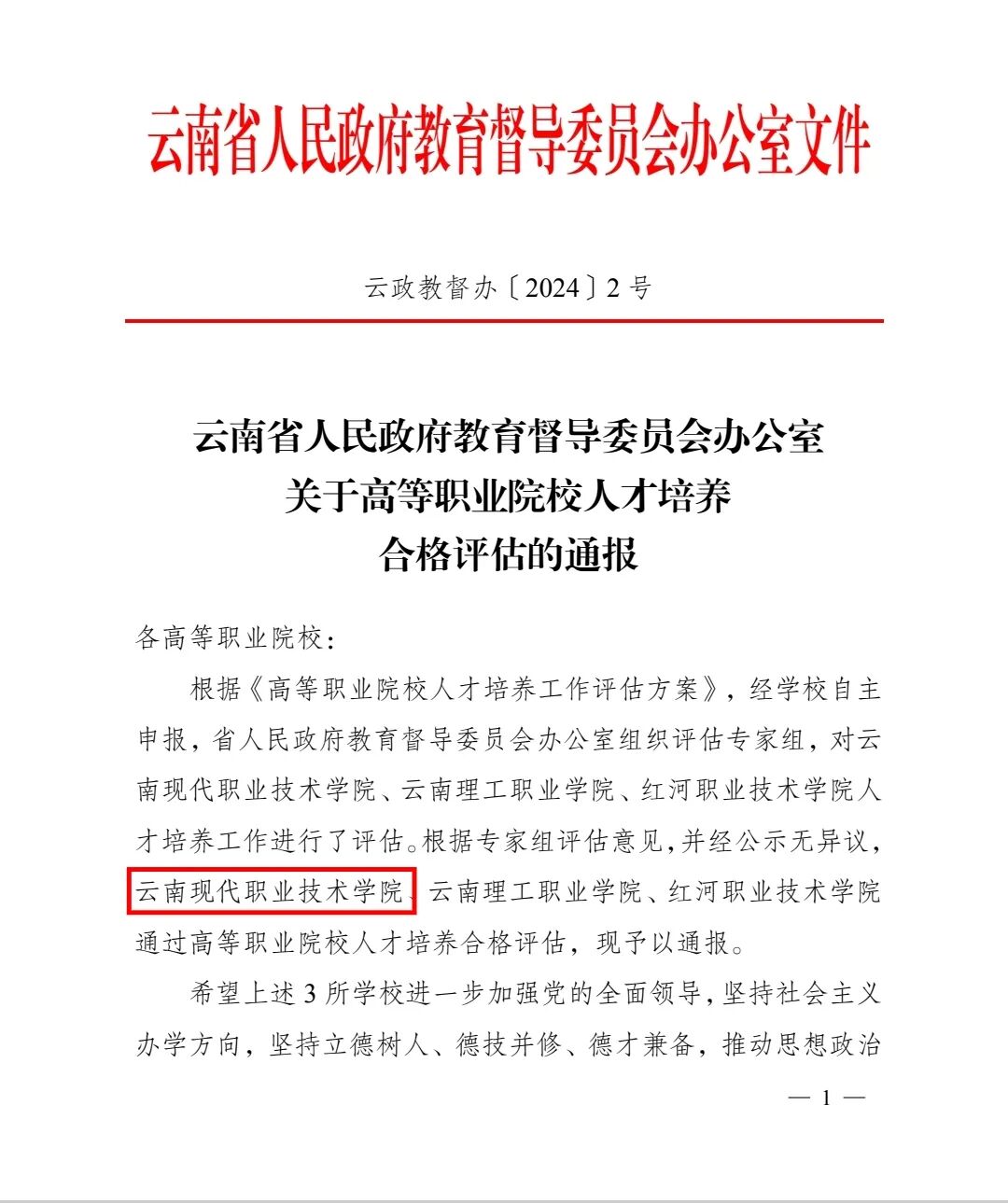 1月23日,云南省人民政府教育督导委员会办公室发布《云南省人民政府教育督导委员会办公室关于高等职业院校人才培养合格评估的通报》,根据专家组评估意见,并经公示无异议,云南现代职业技术学院顺利通过高等职业院校人才培养合格评估。