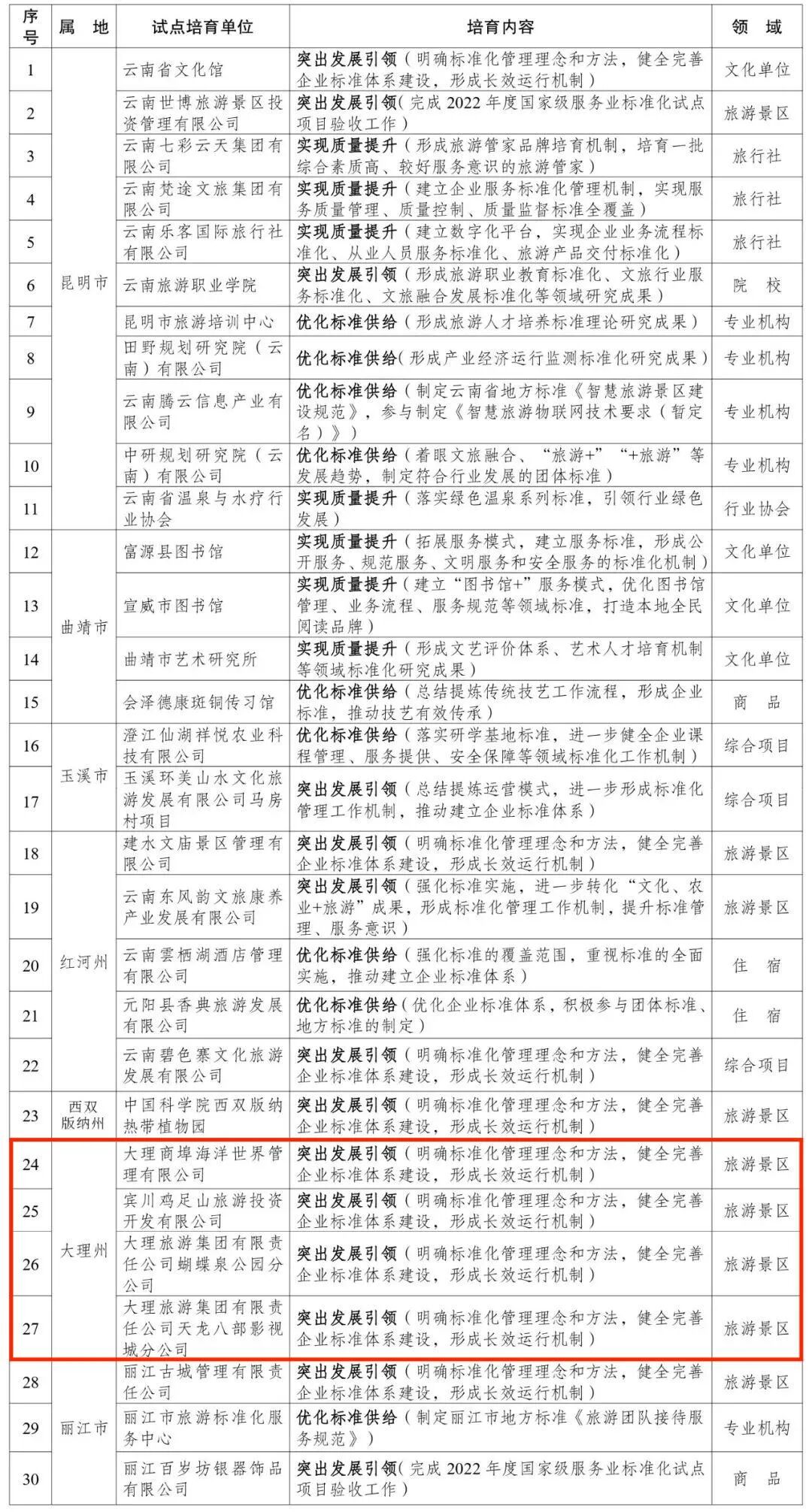 为探索构建云南省文化和旅游标准化试点机制,进一步提高文化和旅游行业标准化工作成效,提升文化和旅游行业竞争力,云南省文化和旅游厅开展了全省文化和旅游行业标准化试点培育及申报工作。经企业申报、州(市)推荐、省级评审等程序,现确定30家文旅单位为云南省文化和旅游行业标准化试点培育单位(2023—2024年)。