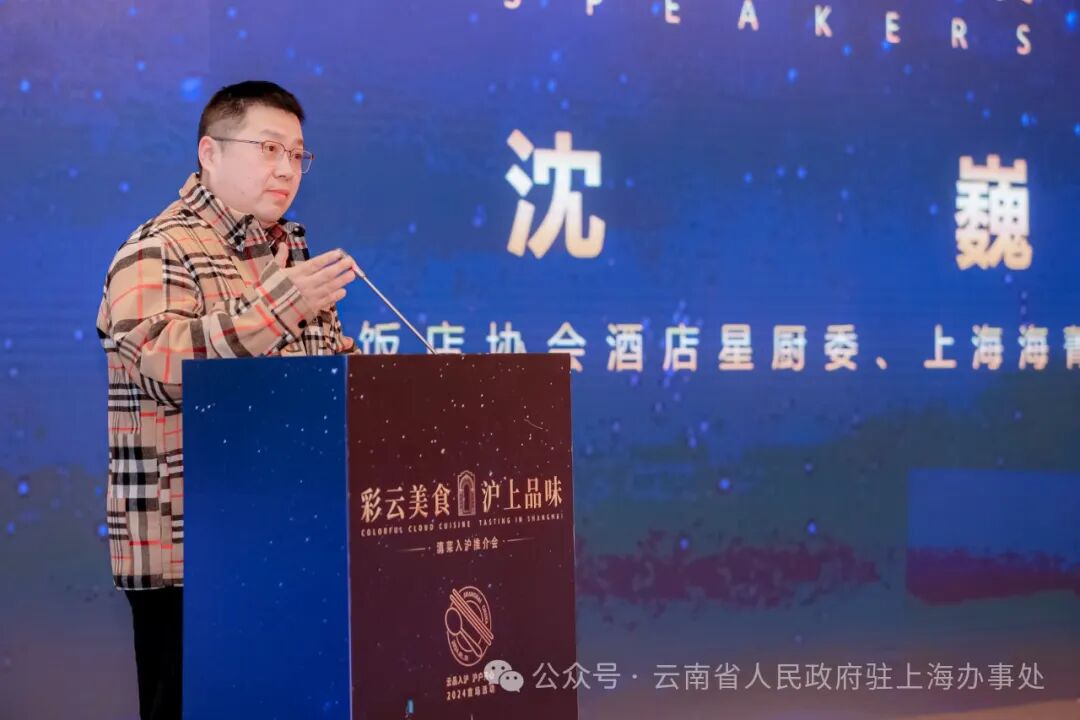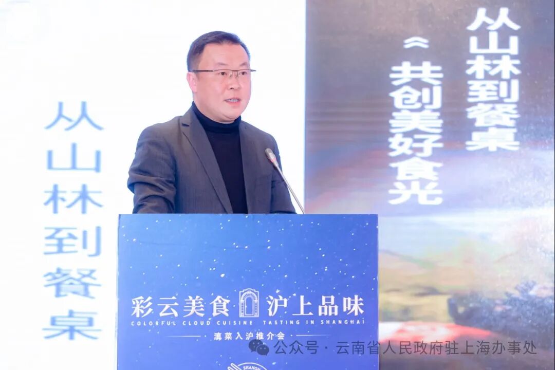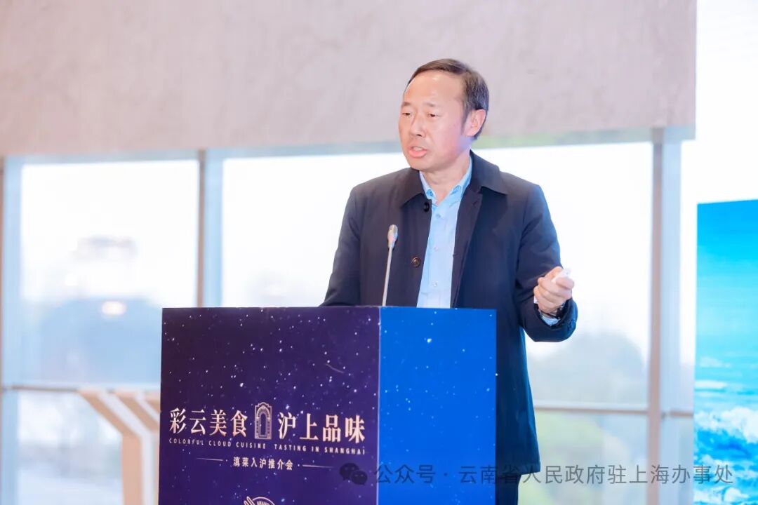 云南省人民政府驻上海办事处党组成员、副主任李继显在发言中介绍了“滇菜入沪”的工作情况。他介绍说,云南得天独厚的生态环境孕育了全世界独一无二的丰富食材;淳朴善良的少数民族“食物传情,寄情寓食”的传统造就了独树一帜的滇菜文化。