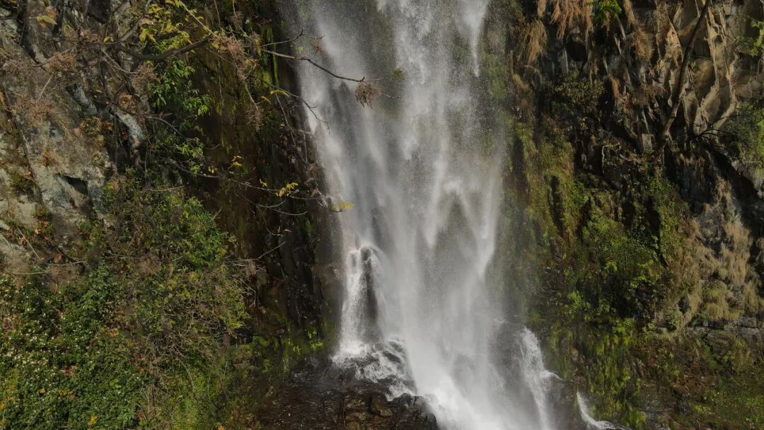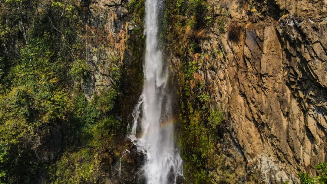 岩瀑布,高673米、宽10米,是云南滇西最高、最大的天然叠水。远观如银带,珠泻银落,近看似玉絮飞花,雨雾升腾。十里远眺,晴空霓虹,神奇壮观,犹如仙女起舞飘飘然,酷似一幅绝妙的山水画。