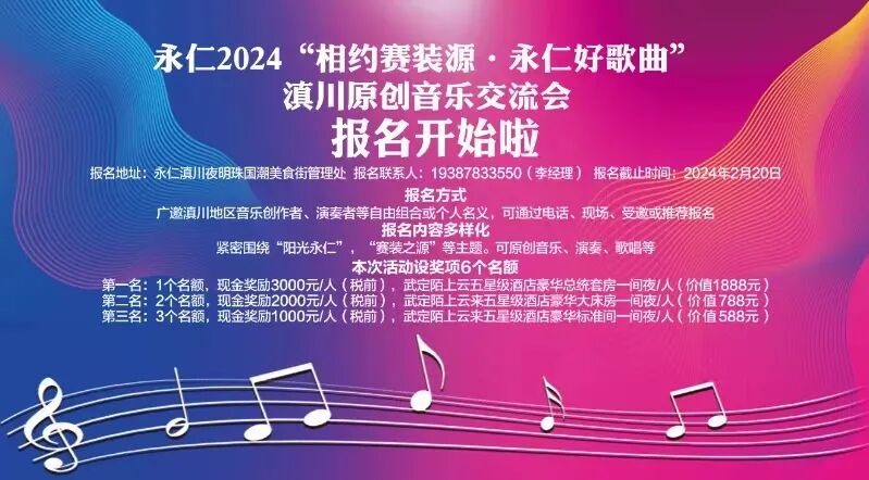 报名内容多样化:紧密围绕“阳光永仁”“赛装之源”等主题。可原创音乐、演奏、歌唱等,带有永仁特点的原创音乐为佳。本次活动免报名费。本次比赛由评委团5名评委评判。评判标准,总分10分,去掉最高分与最低分,取中间3名评委评分平均值,最高分者为第一名,以此类推。选出前6名进行奖励。所有获奖作品在永仁县拥有使用权。