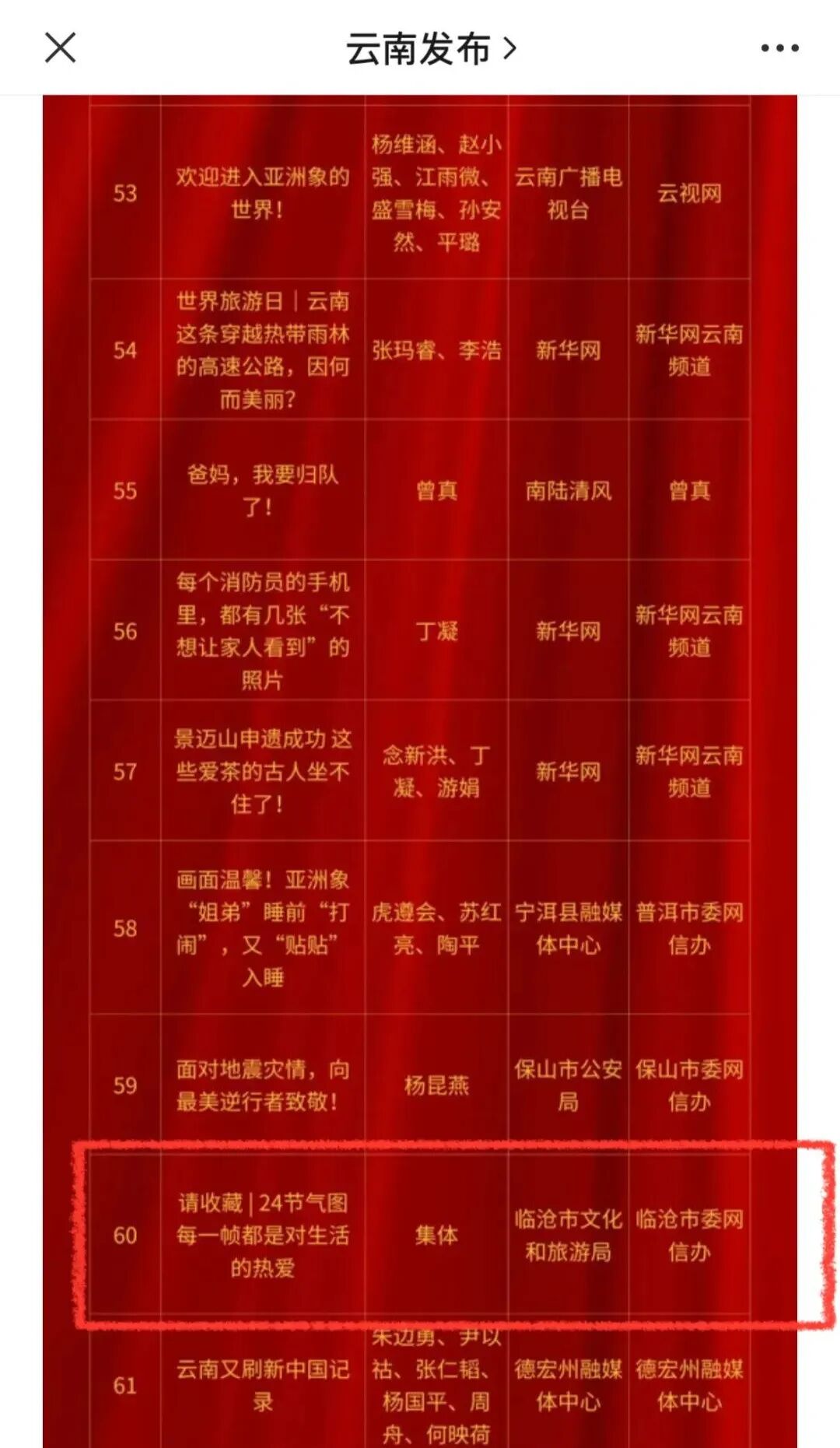 一年又一年,立春、雨水、惊蛰、春分、清明、谷雨、立夏、小满、芒种、夏至、小暑、大暑、立秋、处暑、白露、秋分、寒露、霜降、立冬、小雪、大雪、冬至、小寒、大寒。一张又一张节气图片宣传了临沧,让更多人看见临沧的美。