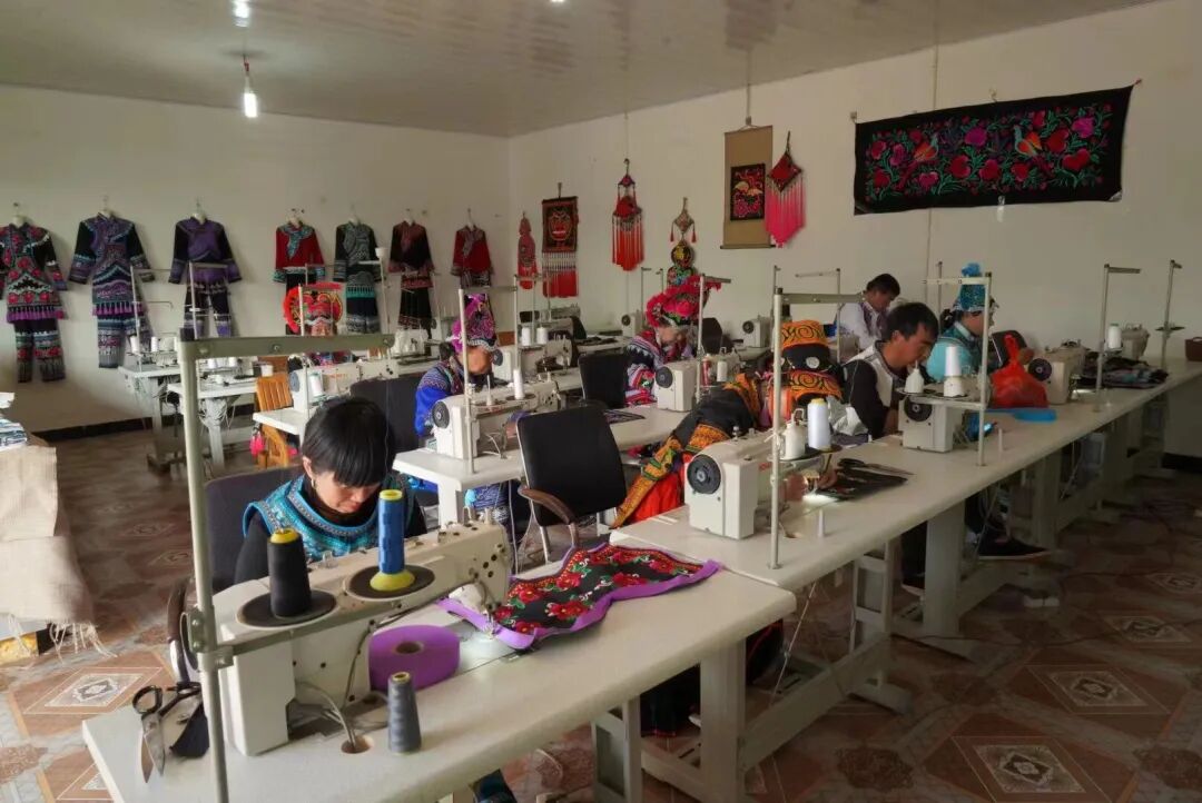 几位绣娘身后不远处的“彝绣扶贫车间”就是2019年通过争取沪滇合作项目建成并投入使用的,该项目投资50万元,采购了绣花机1台,电动缝纫机40台,锁边机8台,印花机2台,还有价值68000元的绣花布、针、线等刺绣物资。“以前,像我们这样的农村妇女没有较高的文化,没有技术,出去打工也找不到好工作,又照顾不了老人和孩子。后来通过乡上扶持我们成立了合作社、协会和党支部,我很荣幸当选为支部书记,在县乡党委政府的关怀下,我有机会到外面学习新技术和新理念,回来就带着她们一起搞刺绣,越来越多的姐妹加入我们,会踩缝纫机的就到车间操作,会刺绣的可以送货上门让她们绣,绣好我又去取回来。像今天这样,农闲时我们就聚到一起绣绣花、唱唱歌,心情好了,家庭也更幸福了。”李晓丽笑呵呵地说道。
