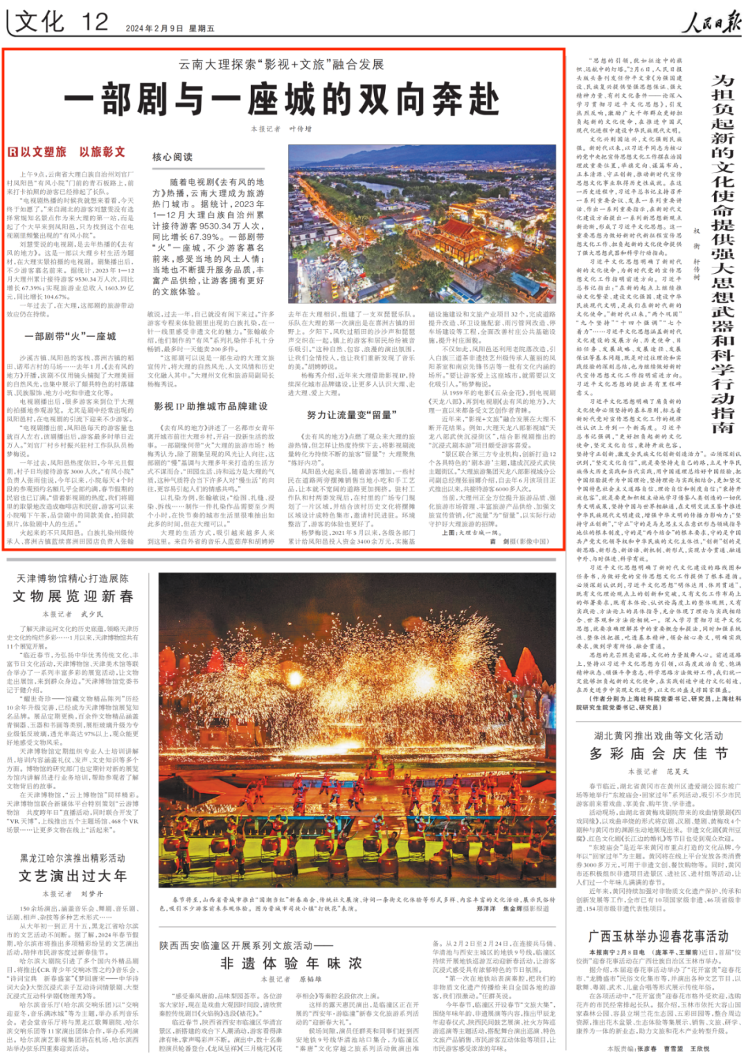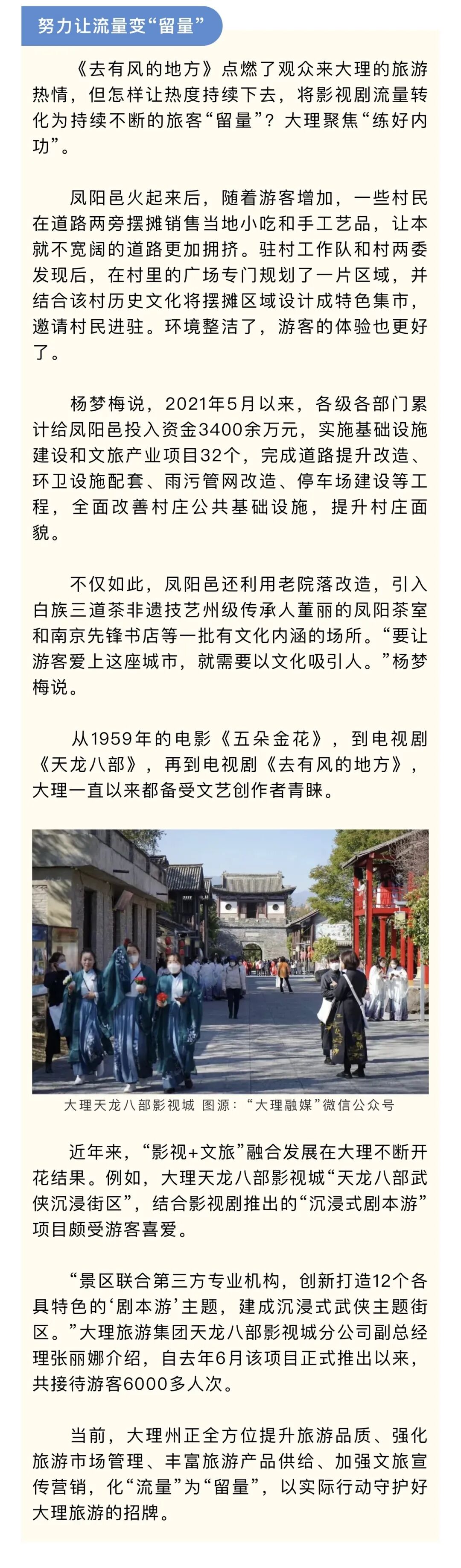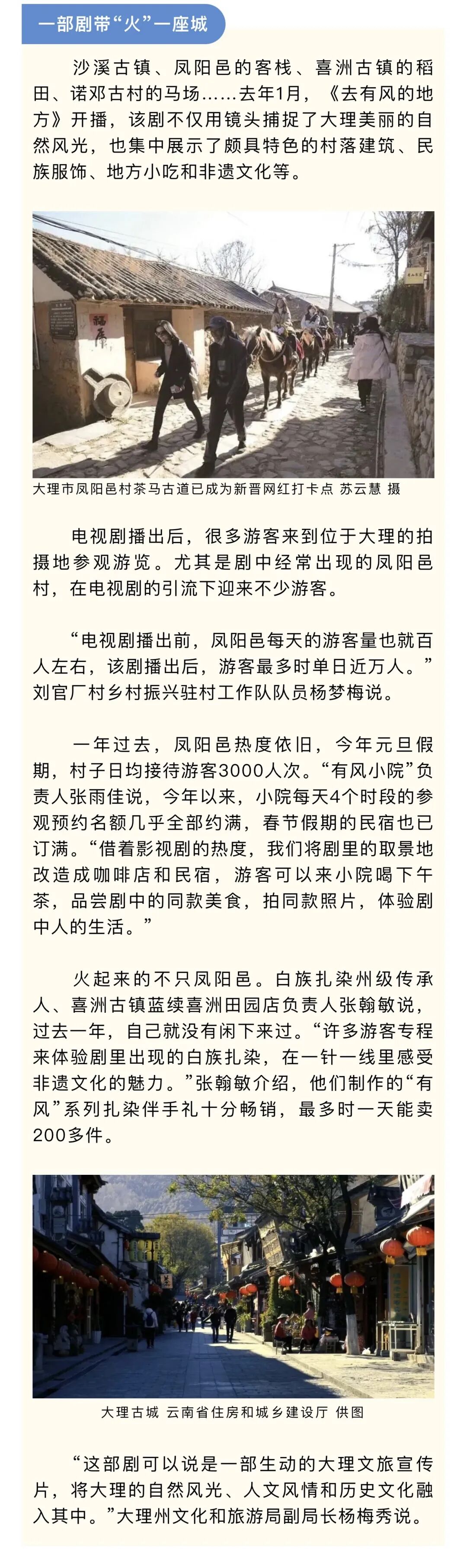 随着电视剧《去有风的地方》热播,云南大理成为旅游热门城市。据统计,2023年1—12月大理白族自治州累计接待游客9530.34万人次,同比增长67.39%。一部剧带“火”一座城,不少游客慕名前来,感受当地的风土人情;当地也不断提升服务品质,丰富产品供给,让游客拥有更好的文旅体验。