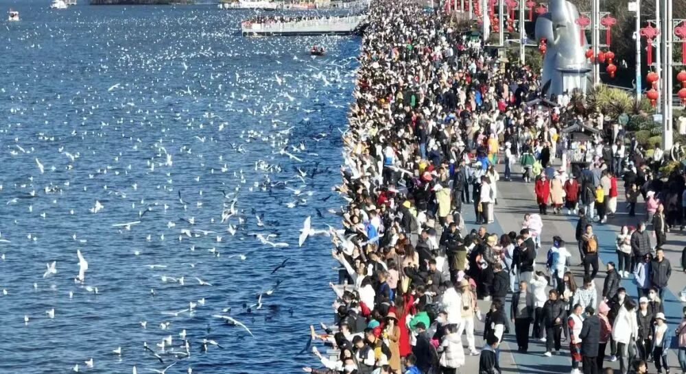 (春节假期,市民、游客在昆明滇池海埂大坝喂红嘴鸥。张继洪 摄)