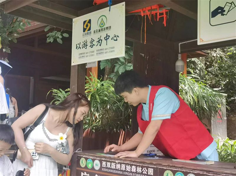 曼听御花园景区则提供了微信扫码购票的快捷服务,并设置一个指示牌安排一位志愿者,为游客提供一对一的贴心服务。游客李光林表示:“智能手机功能太多,我们老年人根本玩不转,要不是有这些年轻的文旅志愿者,我恐怕要耽误不少时间在购票上,真的很感谢。”