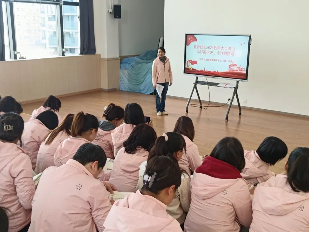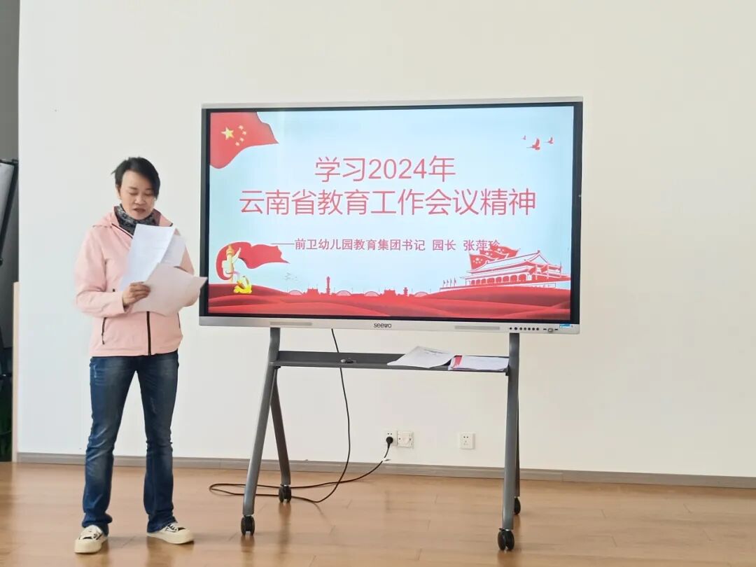 首先,张萍珍带领全体教师对《教育部长2024教育大会讲话:念好数字诀,走好强国路》和《2024年云南省教育工作会议精神》进行了解读,接着又引导教师围绕《作为普通教师如何领会2024教育工作会议精神》进行了学习和思考,鼓励全体教师深刻领会会议精神,提高思想觉悟,紧跟时代步伐,争做新时代优秀教师。最后,张萍珍对幼儿园本学期的园务工作进行了全面部署。