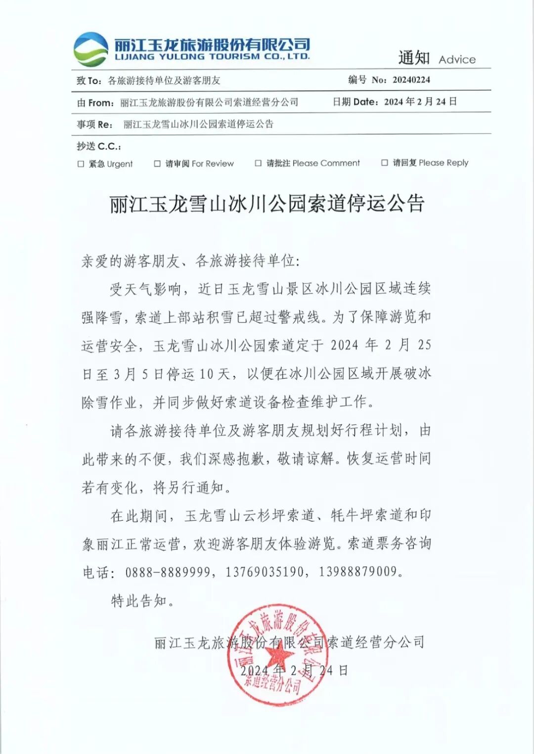 受天气影响,近日玉龙雪山景区冰川公园区域连续强降雪,索道上部站积雪已超过警戒线。为了保障游览和运营安全,玉龙雪山冰川公园索道定于2024年2月25日至3月5日停运10天,以便在冰川公园区域开展破冰除雪作业,并同步做好索道设备检查维护工作。