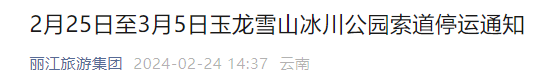 在此期间,玉龙雪山云杉坪索道、牦牛坪索道和印象丽江正常运营,欢迎游客朋友体验游览。