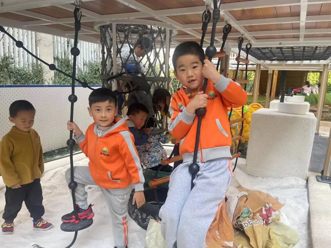 幼儿们惊奇地发现,原本就受他们欢迎的沙池不仅变得更漂亮了,还变得更加妙趣横生了。工人叔叔们巧妙地把大型玩具搭建在沙池的上方,使大型玩具和沙池和谐地融合在一起,不仅遮挡了雨水和落叶,使沙池得到更好的维护,还增添了筛子、梯子、绳索、圆柱筒等可供幼儿攀爬、摇荡、玩乐的设施,既增添了玩沙活动的趣味性,又使幼儿园的立体空间得到了巧妙的利用。