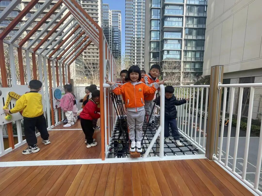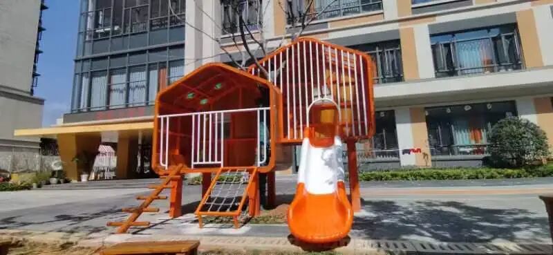 操场上,造型卡通、颜色亮丽的小木屋吸引了幼儿的眼球,幼儿们采取攀爬网格或者木条的方式爬上小木屋,然后选择滑滑梯的方式从木屋上回到地面,他们乐此不疲地玩乐着,欢声笑语回荡在幼儿园的各个角落。