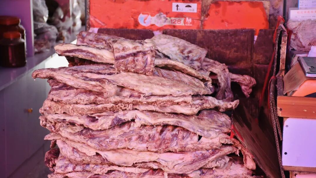 丽江腊排骨取自本地特有的走地猪,加上适量的盐腌制后悬挂在阴凉透风的地方风干而成。走在丽江的街头,在不少卖土特产的商铺可以看见,墙上或是梁上都悬挂有数块整扇的腊排骨。
