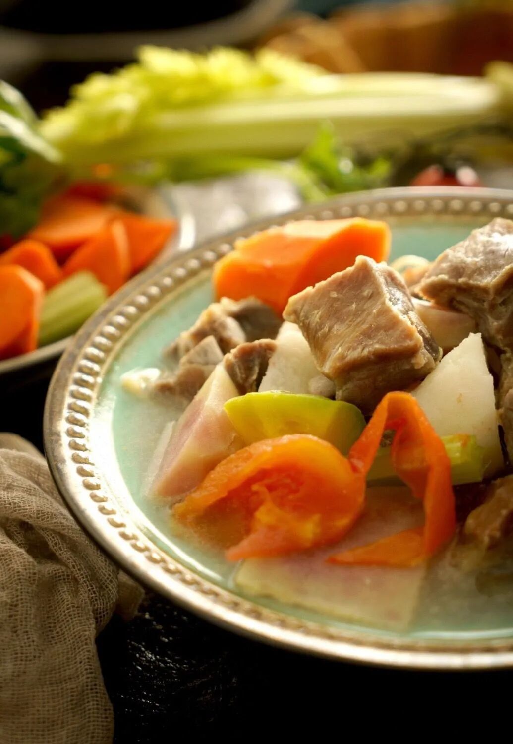 腌制好的腊排骨,肉质干爽紧实、色泽发亮,闻起来有股淡淡的肉香,配上时令蔬菜,煮出来的火锅汤汁浓郁、味道醇厚。