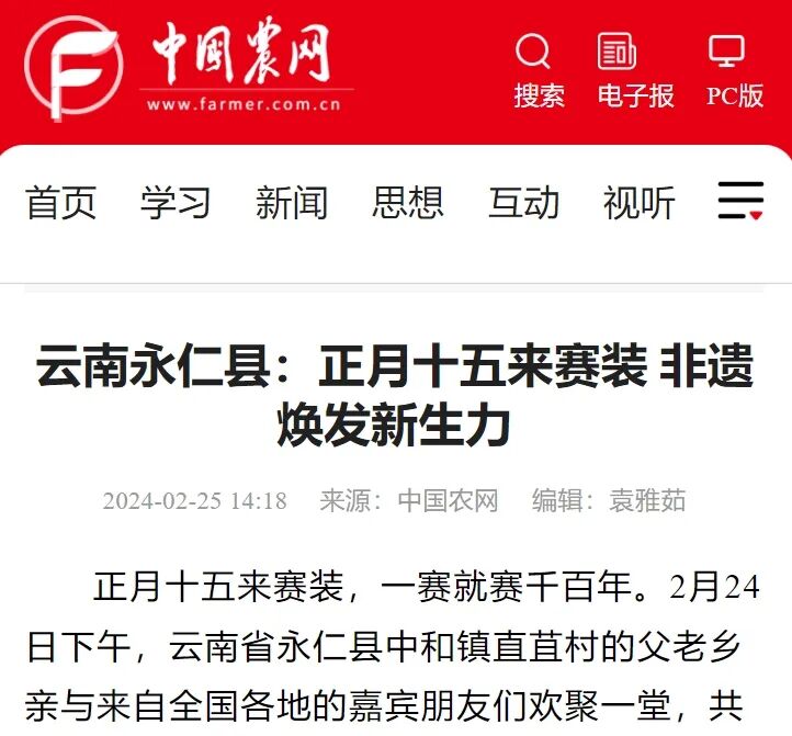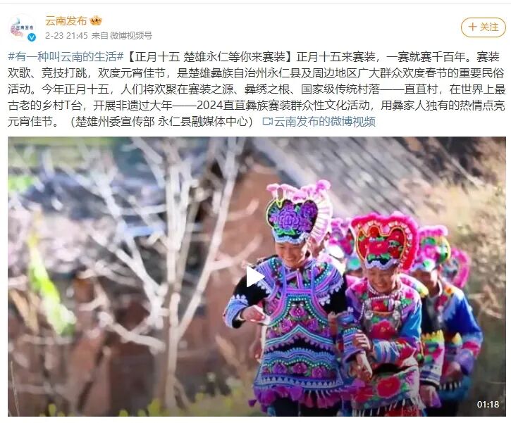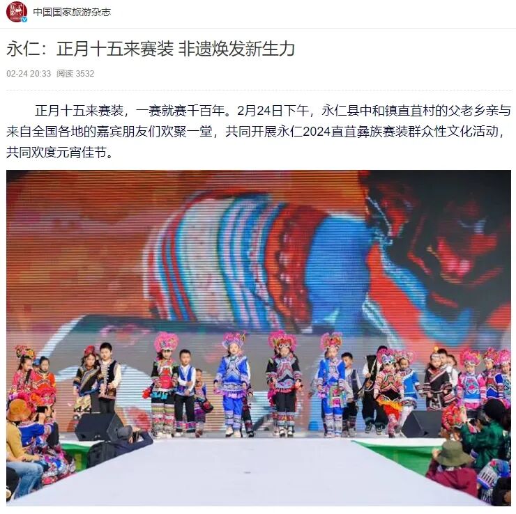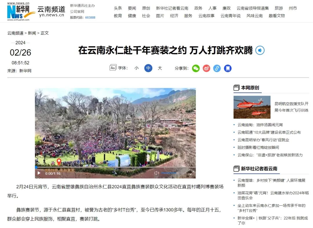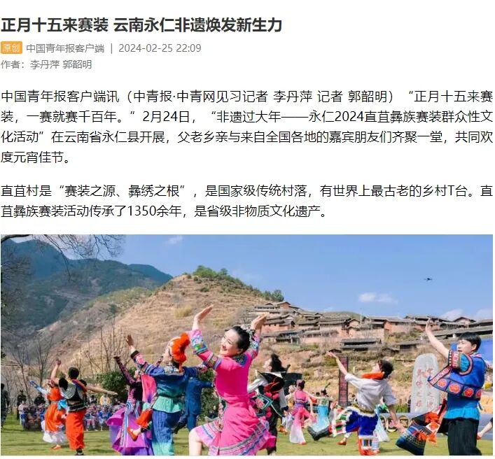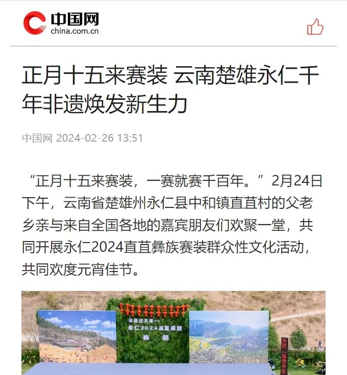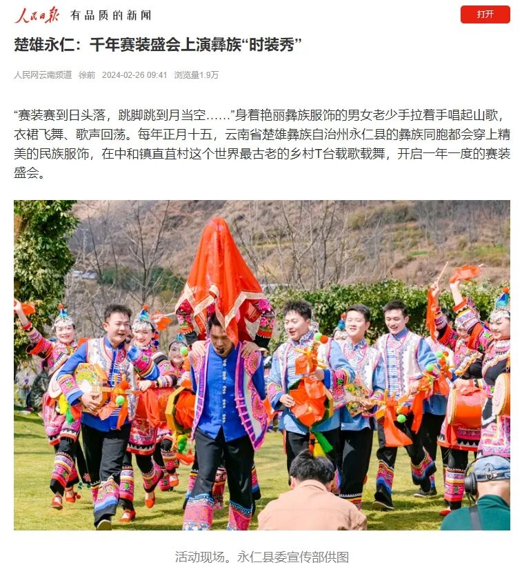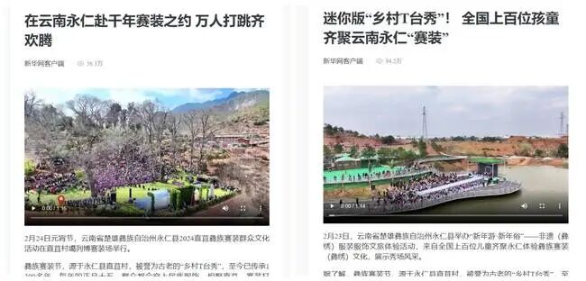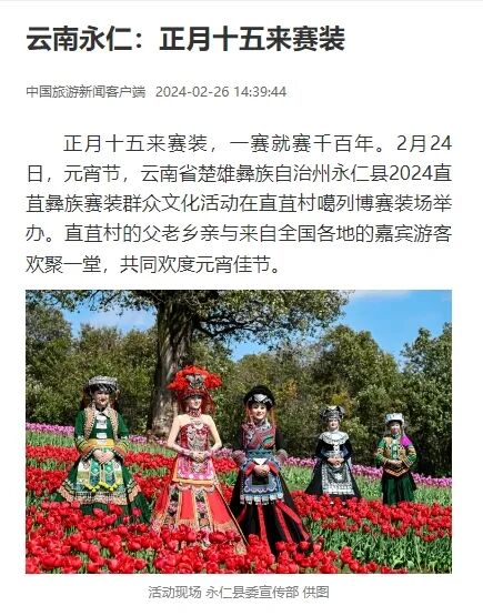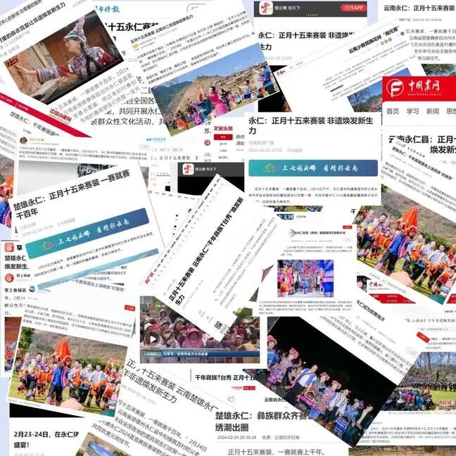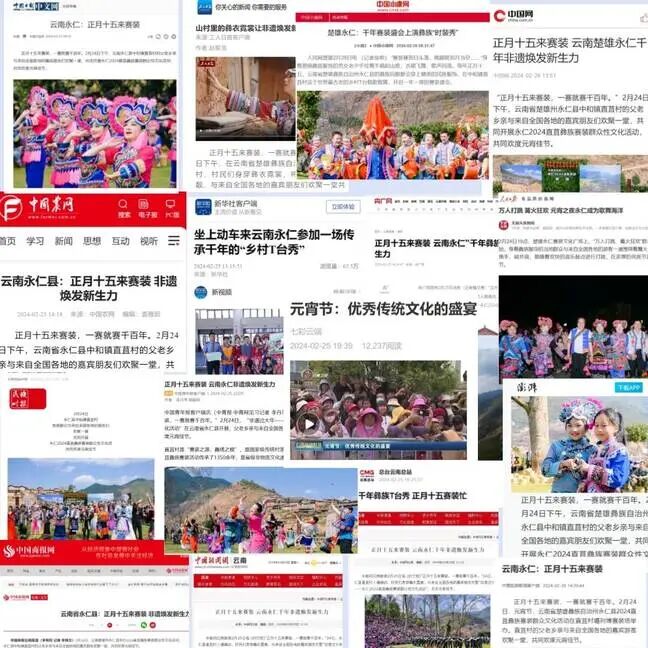 除了以上媒体,央广网、人民日报客户端、央视频、新华社《秀我中国》视频号、中国县域经济报、中国青年报客户端、中国新闻网云南新闻、中国小康网、中国农网、中国商报、中国日报网视频号、文旅中国、中国日报中文网、云南新闻联播、央视新闻总台云南总站、七彩云端、春城晚报《开屏新闻》、云南日报《云新闻》、云南日报视频号、掌上春城、云南旅游广播微博、七彩云端《云南旅游广播》、中新网云南、探秘云南微博、网易新闻《就爱去旅行》、文旅头条搜狐号、都市时报、云南经济新闻网、综讯、新浪新闻《浪眼看云南》、昆明信息港、澎湃云南、云南省文化和旅游厅网站、云视网、文旅头条视频号、文旅头条新闻网、云南画报、云南新闻网、云南民族时报、学习强国云南学习平台、今日头条《成都日报锦观新消费》、今日头条《就爱去云南》等新闻媒体也对永仁县2024年直苴彝族赛装群众性文化活动进行报道。