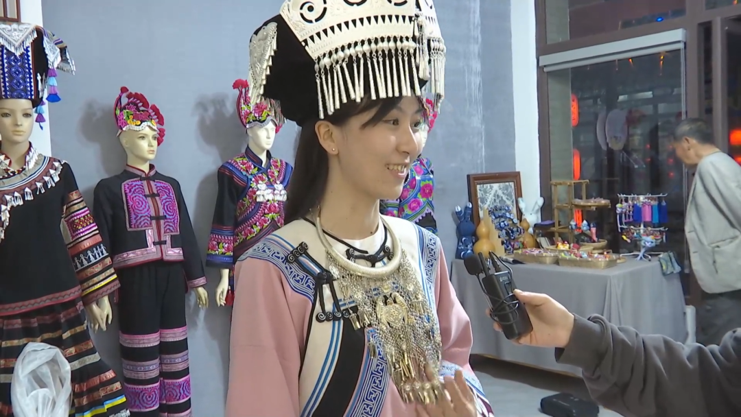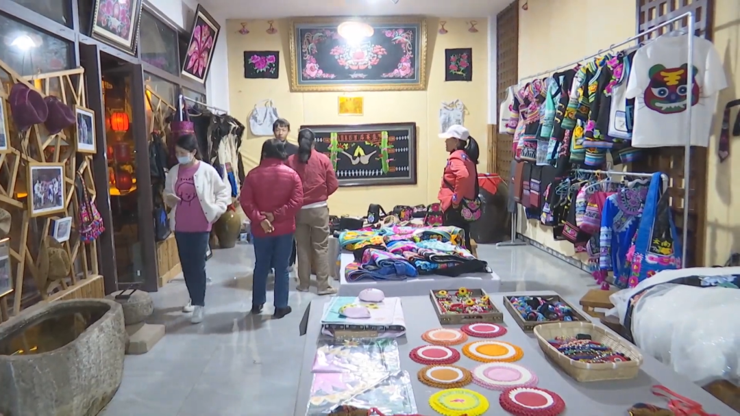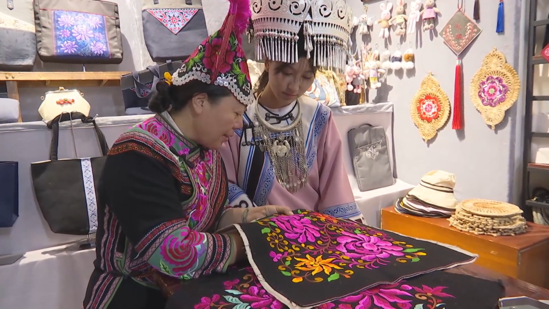 楚雄州非物质文化遗产传承人李丽凤(左一)说:“非遗集市上,客流量很大,还有很多外省的游客,他们也是非常喜欢彝绣,很多人来借我们的衣服穿,体验彝族刺绣。这两天我差不多卖了一万多元,将近两万元,服装也卖了很多套,特别是文创小产品,卖得很好。这次活动让更多游客知道了永仁的彝绣。”