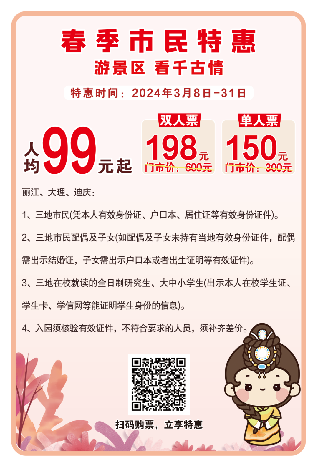 2.3月8日所有女性朋友游览鸡足山,关注鸡足山景区公众号、抖音号,可享受景区门票半价。