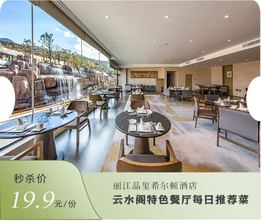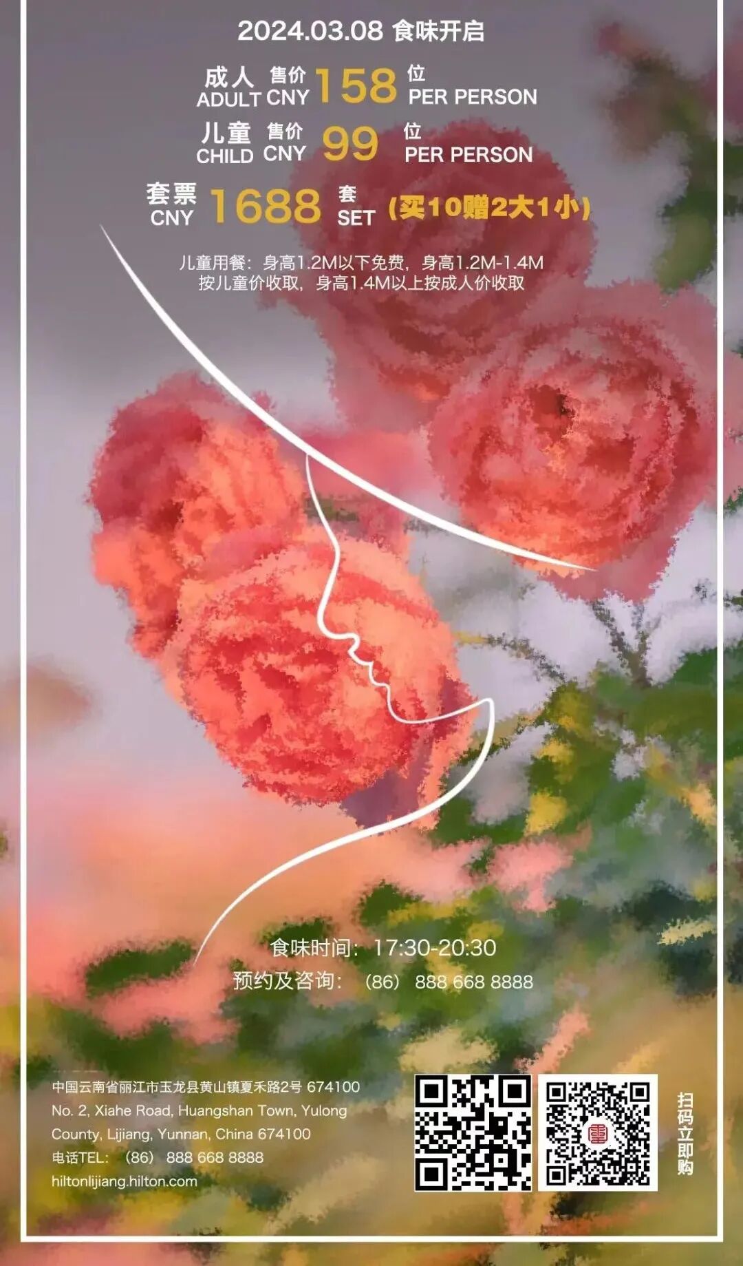 妇女群体来丽江源餐厅就餐,消费满600元,菜品打8.5折(三文鱼除外),还有特惠三八节套餐,原价680元的双餐套餐只要550元,烧烤、炒菜随便选。此外,景区小吃全天供应,来一份纳西特色小吃也不错。