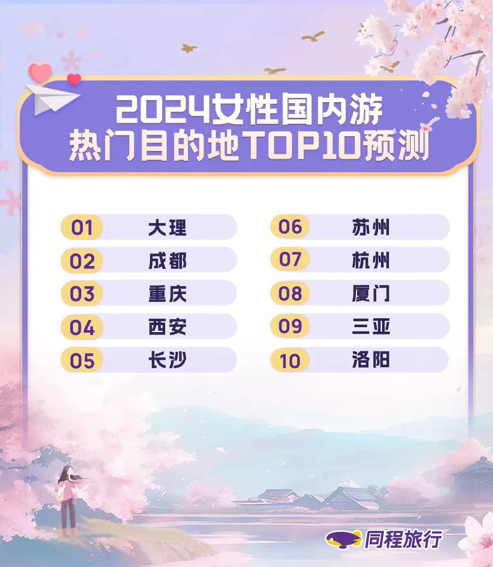 近日,同程旅行发布了《2024中国女性旅行趋势报告》(以下简称《报告》),基于平台大数据分析预测了2024年度女性消费者的旅行趋势。《报告》显示,在出游目的地选择方面,2024年女性消费者不仅追“网红”城市,同时也爱历史文化名城。今年比较受女性青睐的国内长线游目的地主要有大理、成都、重庆、西安等地。