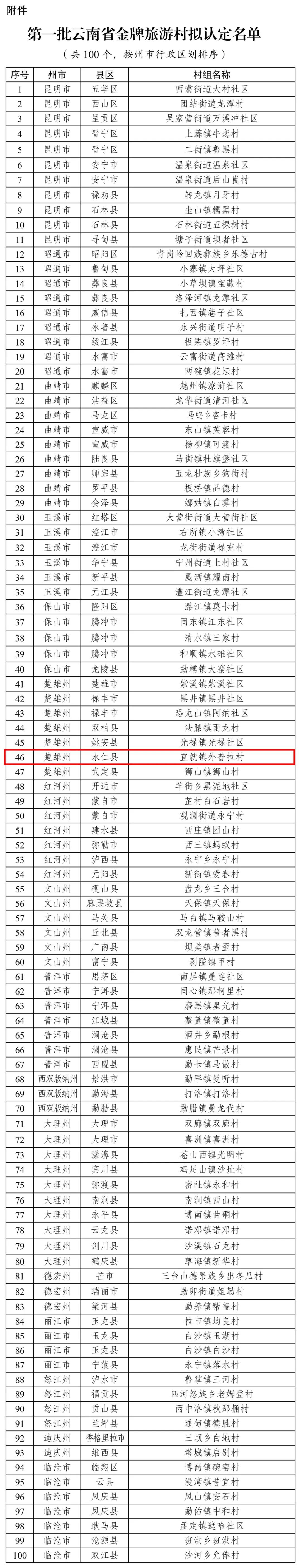 云南省文化和旅游厅公示了第一批云南省金牌旅游村,全省共有100个村拟入选,楚雄州永仁县宜就镇外普拉村名列其中。