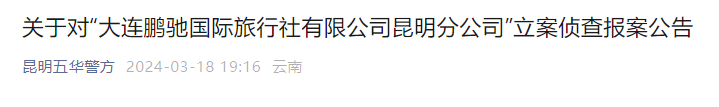 关于对“大连鹏驰国际旅行社有限公司昆明分公司”