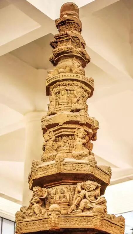 走进昆明市博物馆,宽敞明亮的大厅里,迎面立着地藏寺经幢。地藏寺经幢因建于地藏寺而得名,1982年被国务院公布为全国重点文物保护单位。经幢由五段红砂石雕刻而成,高6.5米,幢体呈七层八面的宝塔形,层级间有界檐。