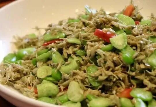 楚雄人春季餐桌上最常见的菜肴当属苦刺花炒豆米,鲜甜的蚕豆和新鲜的苦刺花都是春天的应季食材,苦刺花的微苦和鲜蚕豆米的清甜相融,清新回味。
