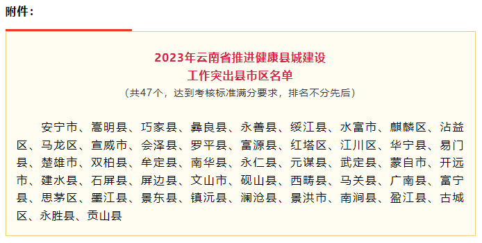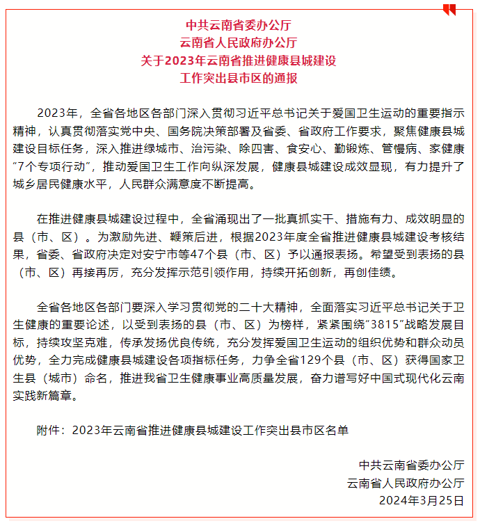 自2022—2024年新一轮创建国家卫生城镇以来,楚雄州永仁县上下紧紧围绕省、州、县《推进健康县城建设三年行动方案(2022-2024年)》工作目标,聚焦“绿城市、治污染、除四害、食安心、勤锻炼、管慢病、家健康”爱国卫生新的“7个专项行动”,全力补齐短板弱项,全面抓好国家卫生县巩固提升、抓好省级卫生乡镇和卫生村创建成果,积极组织开展健康乡镇、健康村创建活动。通过城乡联动,部门协调配合,城乡环境得到综合治理,病媒生物防制工作深入开展,食品加工经营重点场所、重点单位“三防”设施合格率达95%以上,城乡人居环境全面改善,影响居民健康的主要因素得到有效控制,人民群众生活幸福指数不断提升,健康县城建设取得实效。2023年“病媒生物防治先进城区”顺利通过省、州现场评估验收;“国家卫生县”通过了州级现场复审;维的乡、猛虎乡、宜就镇创建国家卫生乡镇工作通过州级现场评估;3个乡镇(宜就镇、猛虎乡、中和镇)5个行政村(麦拉、云龙、地什苴、直那、夜可腊)申报创建省级健康乡镇、健康村工作接受了州级现场评审。同时,4个省级卫生乡镇33个省级卫生村顺利通过复审。健康县城建设考核与楚雄市、双柏县、牟定县、元谋县、武定县、南华县并列全省第一。