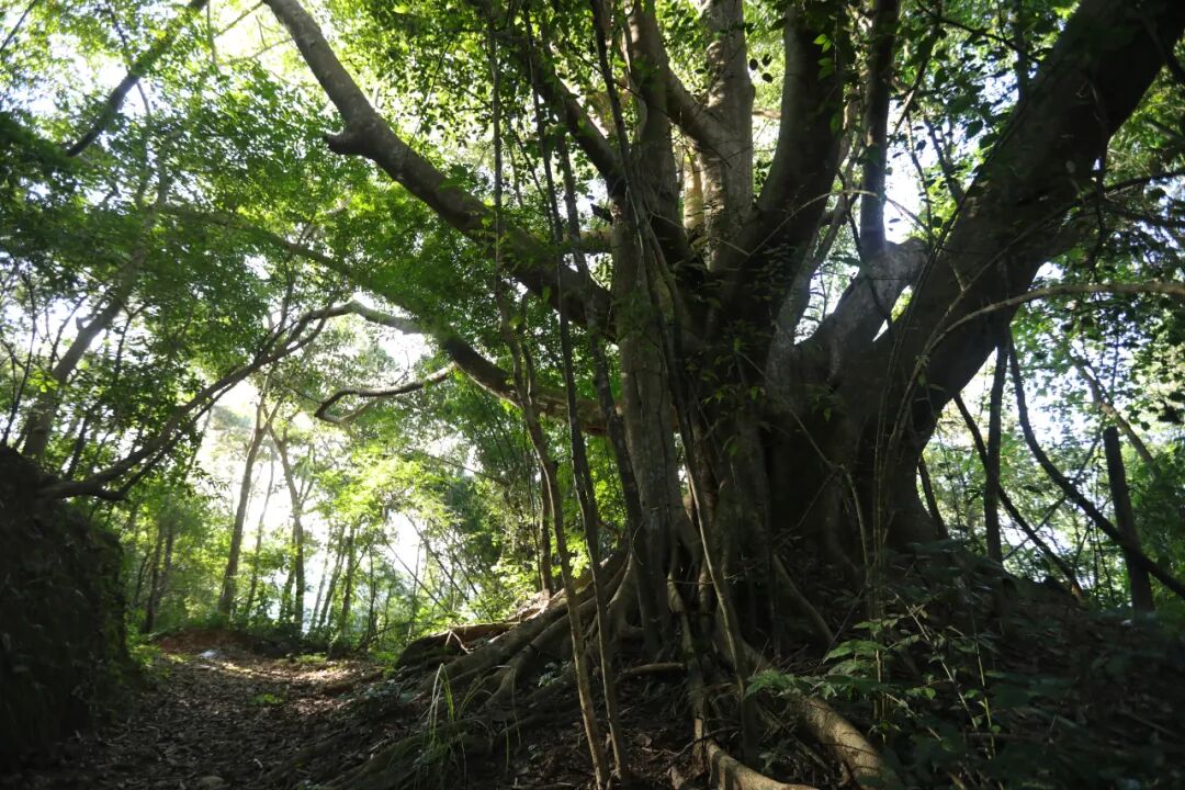 栈道的尽头是令人叹为观止的独树成林和天坑,这棵400多年的古榕树据说还有一段动人的传说,80多条根立于地面, 巨大的树冠像撑开的巨伞,使之成为东南亚最大的榕树。旁边的天坑深40多米,茂密而丰富的植被覆盖着看似深不见底。高大的独树成林和幽深的天坑毗邻,让人震撼于大自然的鬼斧神工,精妙绝伦。