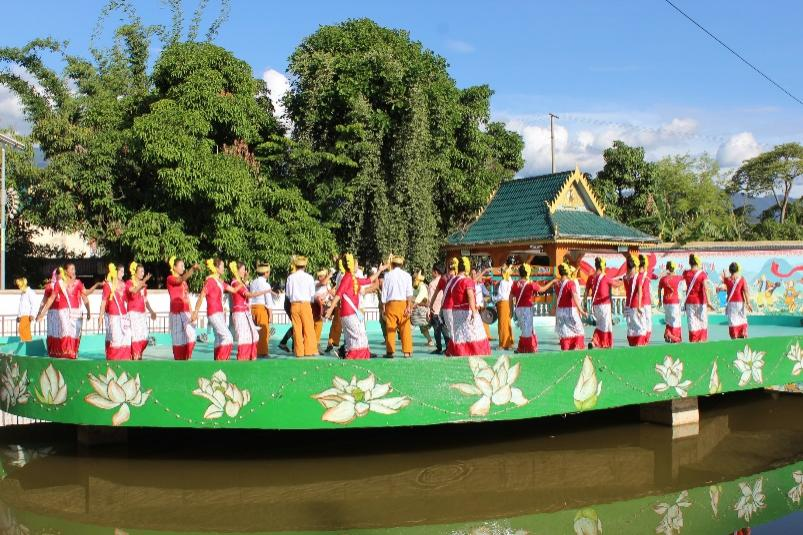 忙蚌村为傣族聚居的村寨,从寨门到村寨内的民居, 也都是傣族风格的建筑,门前的泼水广场宽阔华丽,以漆金的塔尖为中心,外围用石子铺成一圈,涂成孔雀羽毛的颜色。傣族村寨里体验泼水节是必不可少的,堆沙、泼水、丢沙包、赛龙船、放火花及歌舞狂欢等,都有浓郁的傣族风情。