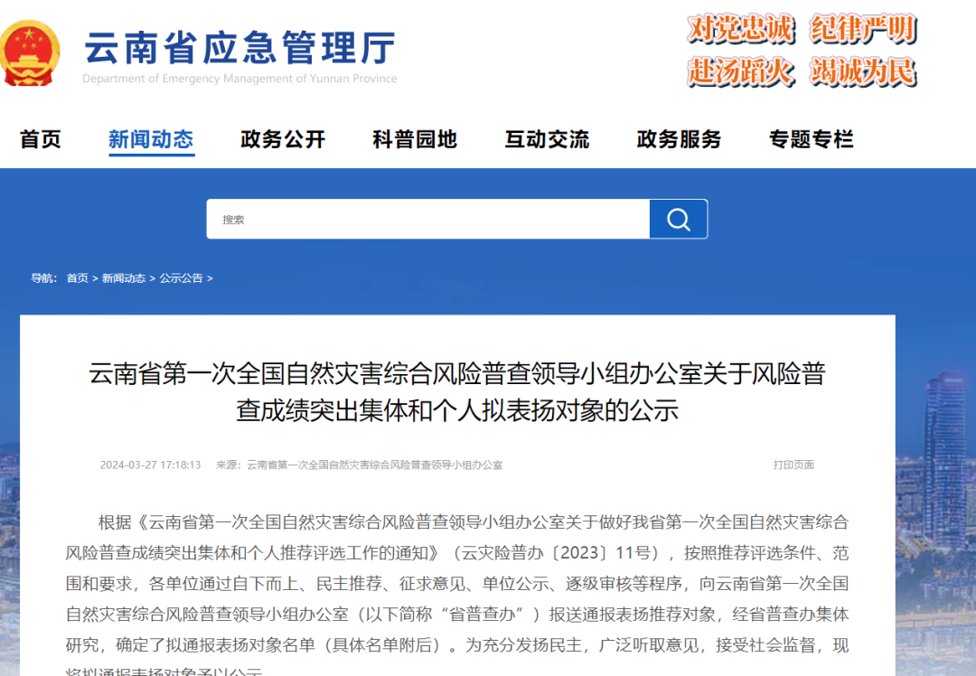 3月27日至4月3日,云南省第一次全国自然灾害综合风险普查领导小组办公室公示了我省第一次全国自然灾害综合风险普查成绩突出集体和个人。楚雄州永仁县应急管理局拟表扬为先进集体,是全省48个先进集体之一。