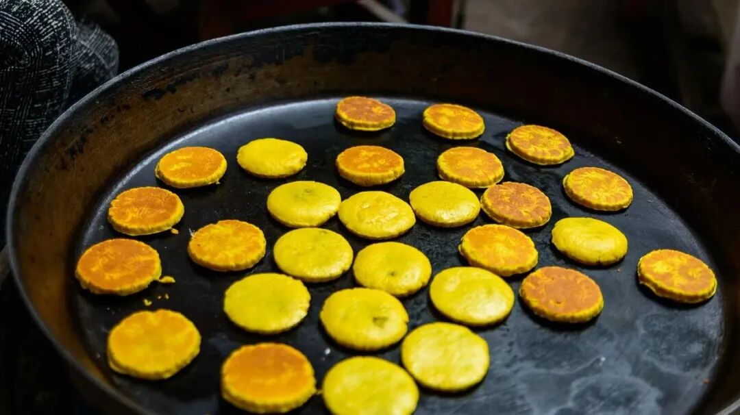 石羊小土饼是用雕花的模具做成,有的雕刻寿桃、鲤鱼、莲花等图案,整体风格简约,注重线条美。选用石羊本地小麦面粉,和面的水用的是山里天然乳香香料熬成的乳香水,甜而不腻,略带清香。