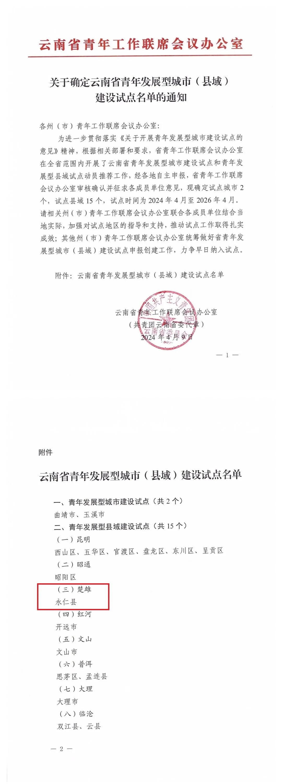 为深入学习贯彻习近平总书记关于青年工作的重要思想,落实《中长期青年发展规划(2016—2025年)》,按照相关部署要求,云南省青年工作联席会议办公室在全省范围内开展了云南省青年发展型城市建设试点和青年发展型县域试点动员推荐工作,经各地自主申报,省青年工作联席会议办公室审核确认并征求各成员单位意见,最终确定了试点城市2个,试点县域15个,试点时间为2024年4月至2026年4月,楚雄州永仁县结合工作实际,制定永仁县青年发展型县域试点实施方案,积极参与云南省青年发展型城市申报,被确定为云南省青年发展型县域建设试点。