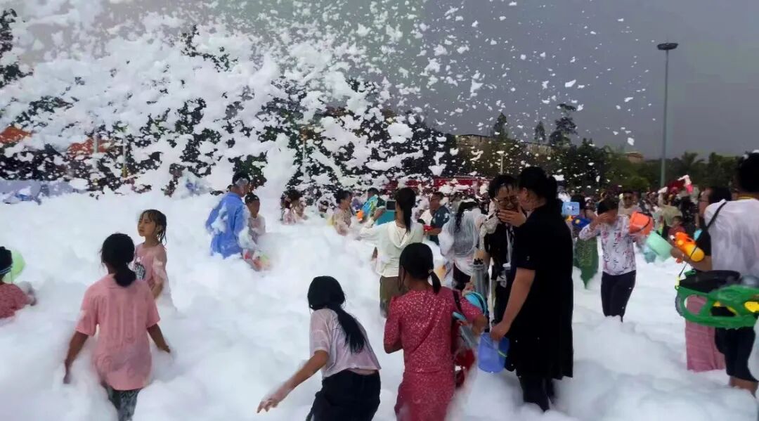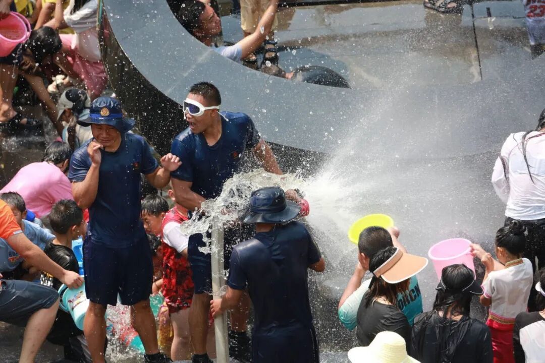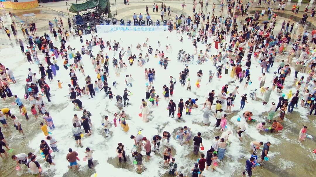 在鑫源路和勐相湿地广场,上演了一场传统与现代相碰撞的泼水盛宴,有人敲着象脚鼓跳着嘎秧舞,也有人跟随DJ的节奏恣意舞动,男女老少身着盛装,携带水枪、水桶等“武器”,相互泼洒幸福吉祥之水,勐相湿地公园广场喷射出阵阵泡沫,把狂欢推向高潮,广场瞬间变成了泡沫的海洋、水的世界,大家随意泼洒,释放激情,越来越多的游客聚集到广场,加入泼水“大战”,现场欢声笑语不断,热闹非凡,大家都尽情享受在这场水花飞舞、酣畅淋漓的泼水盛宴里。