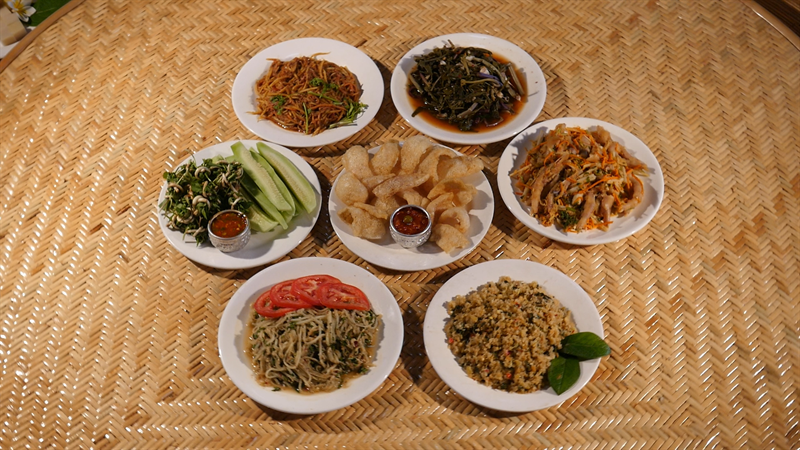 而今,作为“神鱼节”的美食名片,土司宴风味独特,以酸、辣、香为特点,选用的天然食材较多,制作方法有煎、炸、烧烤、蒸、煮、腌、舂等。每年四月的孟连已显暑热,土司宴上数道开胃凉菜酸爽可口、甘凉生津,使人倍感凉意。紧接着热菜、凉菜齐上桌,最后的糯食甜点和清口水果醇绵温婉、余味无穷。