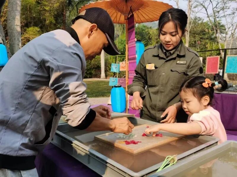 活动期间,游客可以动手参与体验活动,用大象粪便制作纸张,用花瓣在纸张上拼出春天的颜色。