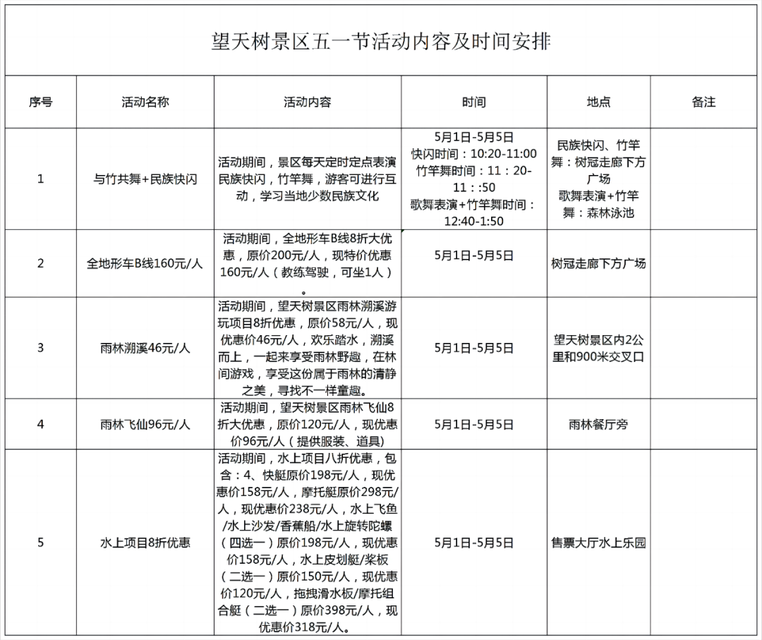 (1)活动期间,体验原始森林公园门票+A段丛林飞跃+往返观光车套餐的游客,可享活动价:245元/人,原价:396元/人 。
