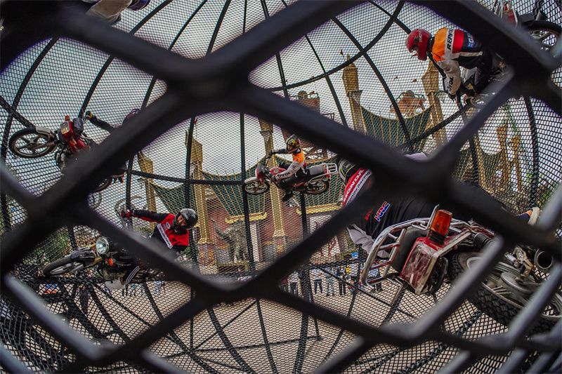 环球飞车,肾上腺素狂飙的震撼炫技。在直径只有5.5米的圆形铁球内,6辆摩托车以每小时80公里的速度为大家呈现了另一个惊险刺激的世界。随着完成交叉穿越惊险动作的专业飞车手们驾驶着特制摩托车,侧身行驶、倒立旋转,完成一系列高难度动作,观众也在心跳加速中感受极速震撼。