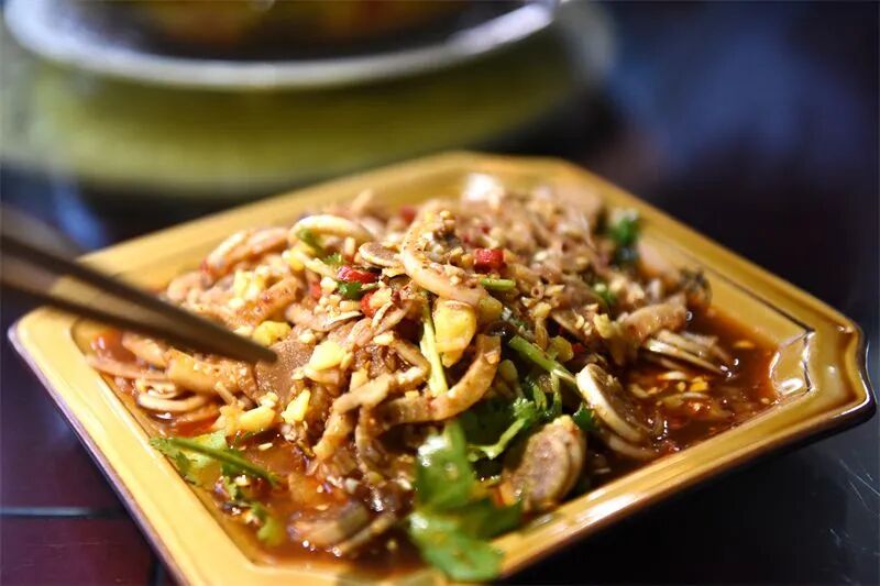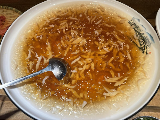 手工制作的凉粉软滑、Q弹,浇上由红油辣子、花椒、葱花、盐、醋、姜、蒜等佐料调成的蘸水,让人口舌生津。挑一块鲜嫩的凉粉入口,酸酸甜甜开胃健脾、爽爽滑滑口感劲道,是十分解腻的一道美味小吃。