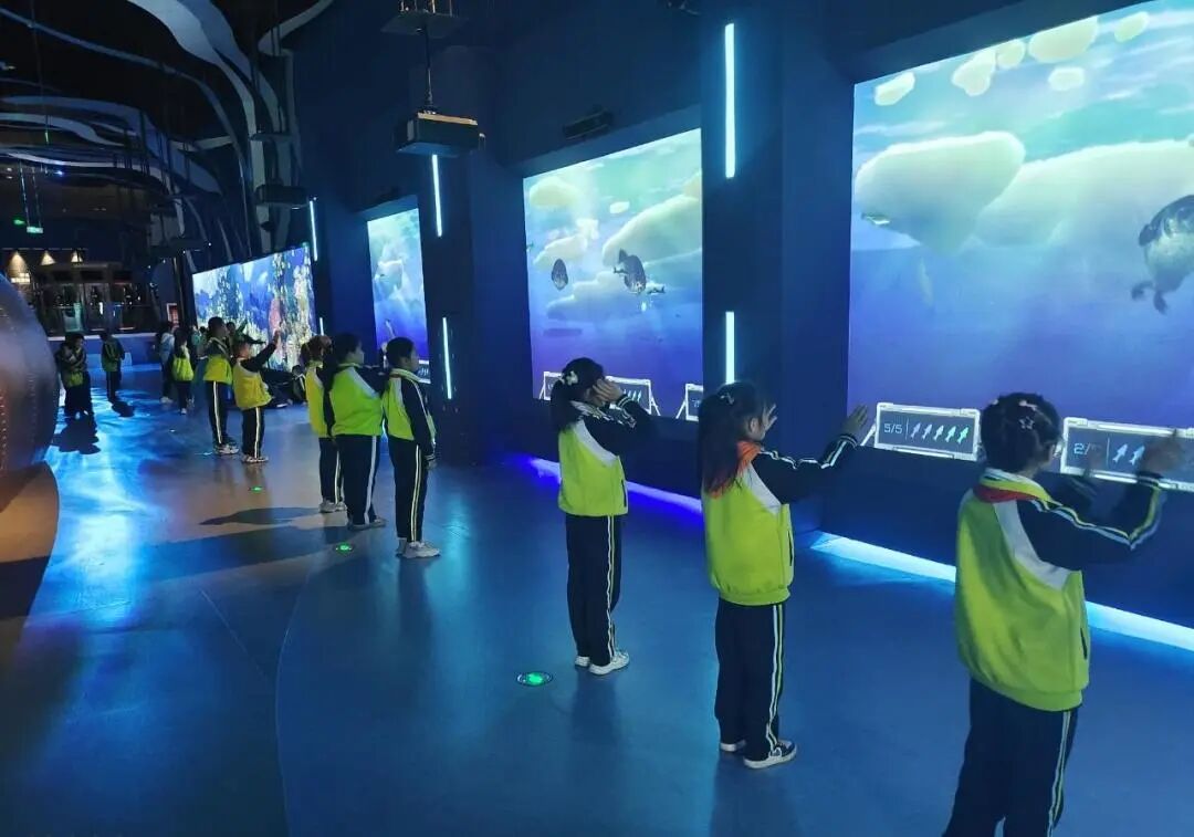 (在飞览天下·新疆会客厅场馆内,观众正在海洋世界主题展区进行科普互动。新疆飞览天下文化发展有限公司供图)