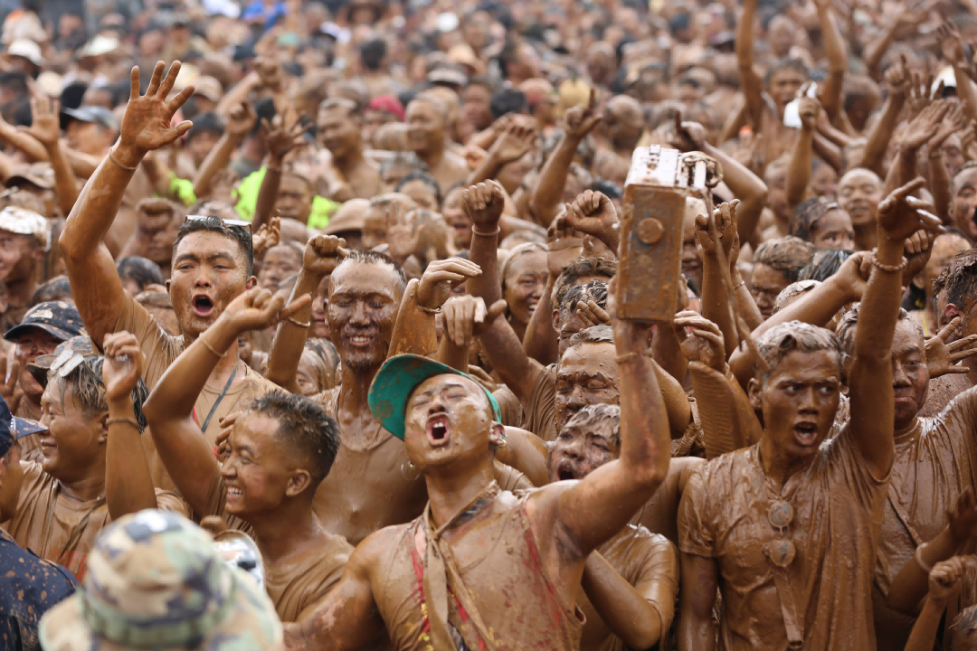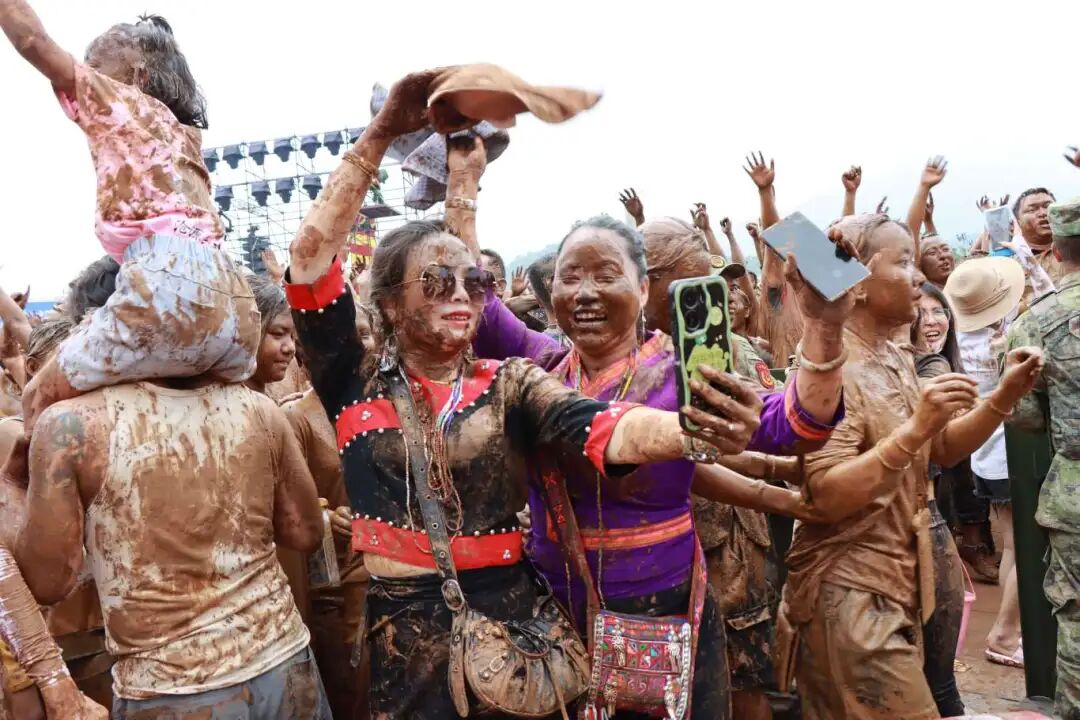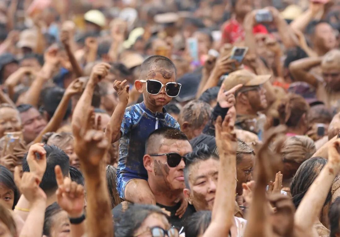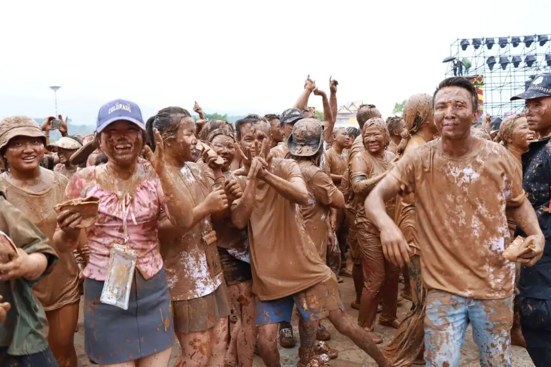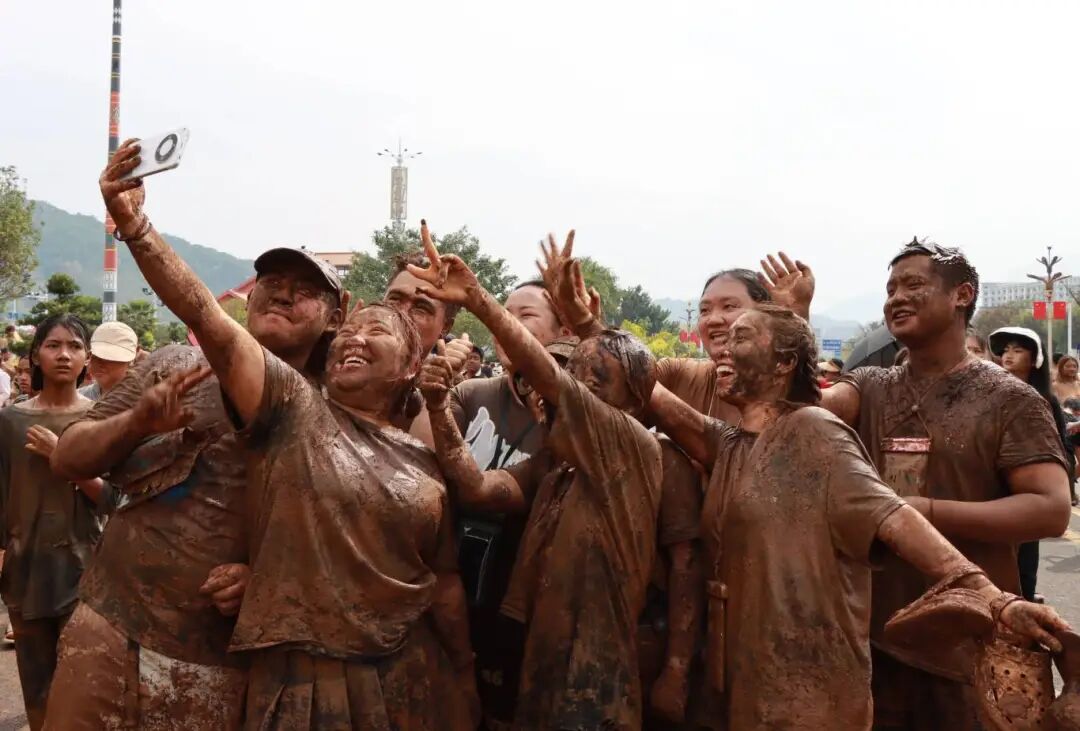 “摸你黑!摸你黑!摸你黑!”沸腾的人群,飞舞的泥浆。不到10分钟,整个摸你黑广场就成了“泥巴的世界”,每个人的身上都被寓意着幸福的“泥巴”包裹,变成了一个个笑容灿烂的“泥人”。鼓声、歌声、笑声,声声开怀,大人、小孩、老人、尽情狂欢。脚步跑动、身体律动、人头攒动,狂欢的热浪一浪高过一浪。