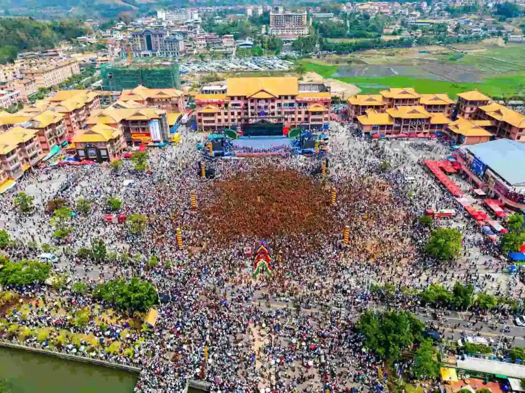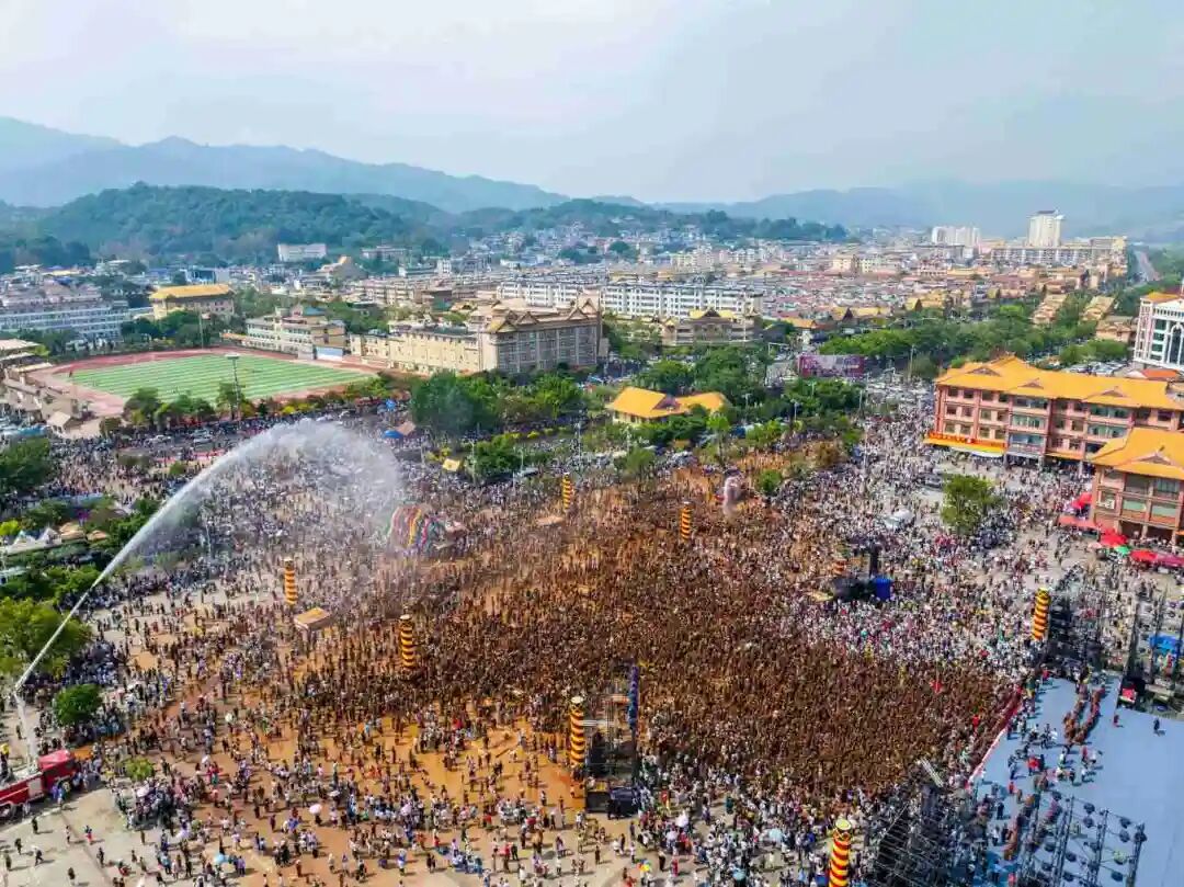 现场“百台木鼓千人甩发”表演原始古朴、粗犷豪放、震撼人心、激情飞扬,给现场观众带来了一场极致的视听盛宴。伴随着浑厚的通天木鼓声、充满节奏电音声,大家开始用 “娘布落”互相涂抹,人们身上沾满了祝福,心中充满喜悦,歌声不断、祝福不停,大家在狂欢中释放压力、享受欢乐。