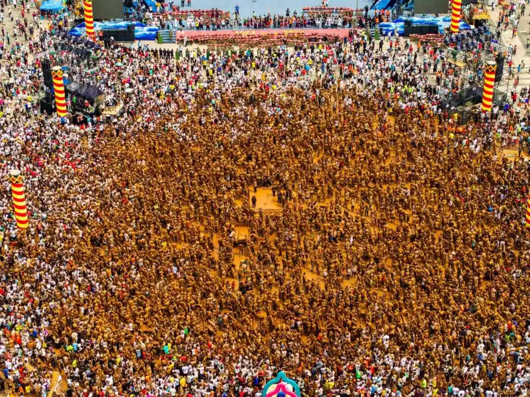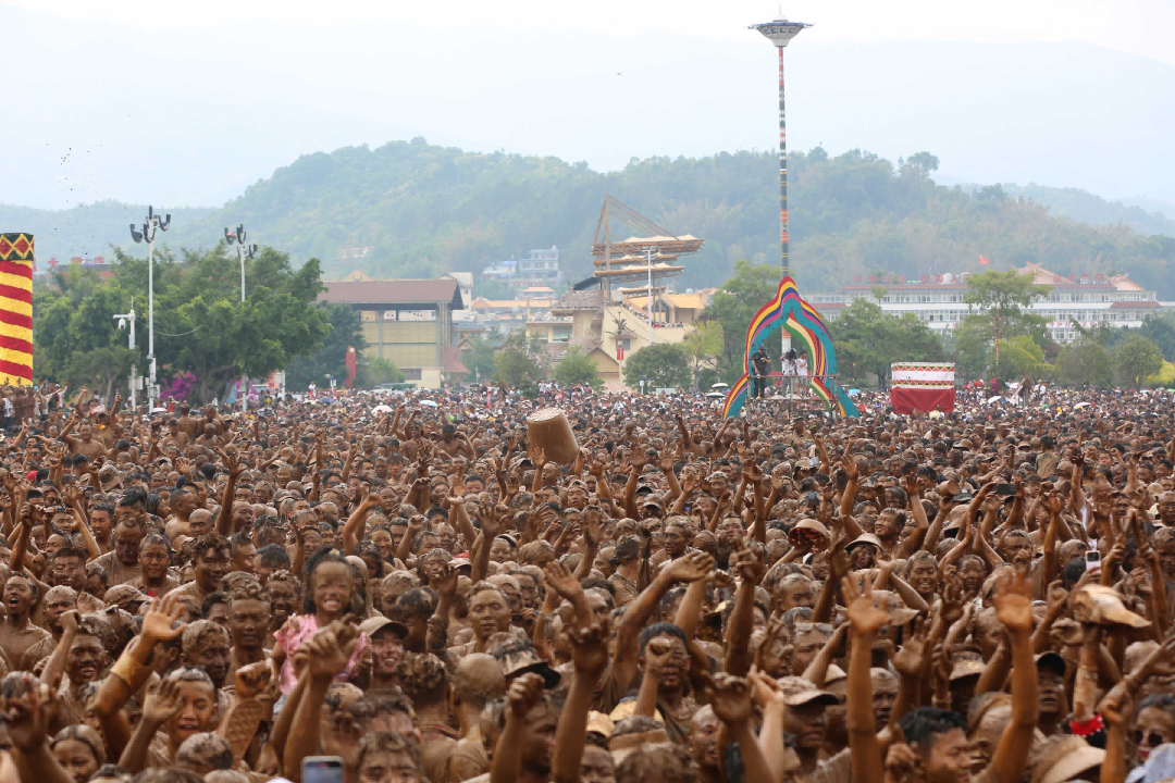 5月2日下午,中国佤族司岗里“摸你黑”狂欢节系列活动来到节日最高潮——“摸你黑”狂欢主题活动暨“百台木鼓千人甩发”,吸引了来自国内外游客和当地群众,齐聚佤山沧源摸你黑广场,和阿佤人民欢聚一堂,欣赏佤族百台木鼓千人甩发表演,感受泥浆飞舞的狂欢。