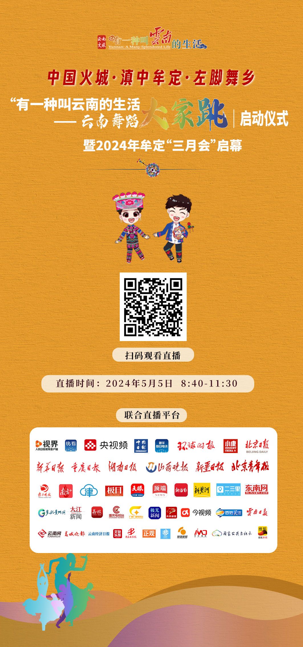 启幕活动将联动央、省、州(市)、县四级融媒体聚合直播,大家可以通过人民日报、新华社、央视频、中国日报、新华每日电讯、环球时报、小康网、北京日报、新华日报、重庆日报、湖南日报、山西晚报、新疆日报、扬子晚报、北京青年报、南方网、天津津云客户端、极目新闻、天眼新闻、顶端新闻、新海南、新黄河、二三里资讯、东南网、多彩贵州网、大江新闻、荔枝新闻、重庆广播电视台、广西广播电视台、极光新闻、奔腾融媒、江西广播电视台今视频、贵州广播电视台百姓关注、云南日报、云南网、春城晚报、云南经济日报、文旅头条、半岛都市报、正观新闻、冰城+、楚雄州融媒体中心、滇中牟定、国家公共文化云、云南省文化和旅游厅、搜狐新闻等50多个平台观看直播。
