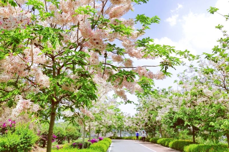 你会穿过白浪村,在牛角咀,打卡这个季节独有的神黄豆花,粉白色的花瓣轻轻摇曳,投下温柔的照影。
