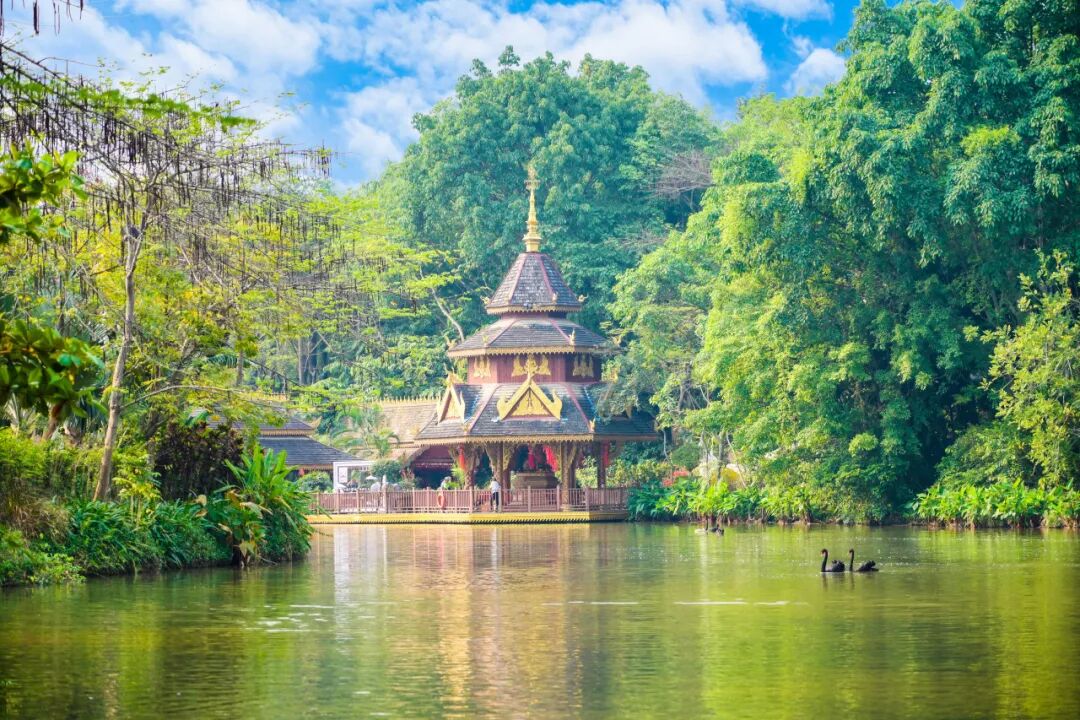 位于景洪市的曼听公园,其前身为傣王御花园,是西双版纳最古老的花园,承载了已传承千年的傣族历史文化,景色宜人,鸟语花香。园区内设有御花园文化区、民俗文化区、铁刀木林区、民族歌舞表演场、红色文化广场等主题区域,让游客一步一景,深度体验傣族优秀传统文化的魅力、智慧和力量。
